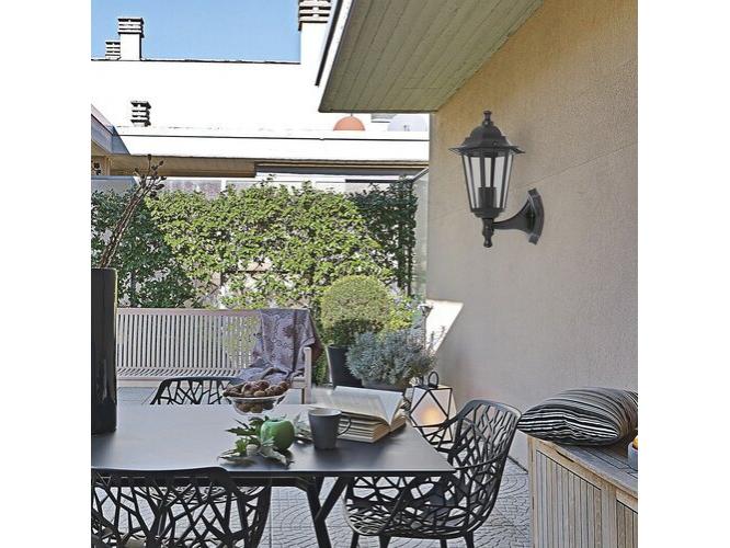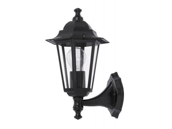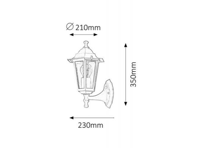 Egy klasszikus stílusú kültéri falilámpa, 1 foglalattal a felső pozícióban. A 35 cm magas, fekete színű fém lámpatest 23 cm-re kinyúlik, a lámpabúrája nagyon átlátszó üvegbetétekkel és IP43 védelemmel rendelkezik. A lámpatest akár 60W-ig terjedő takarékos fényforrással is használható, E-27 foglalattal.