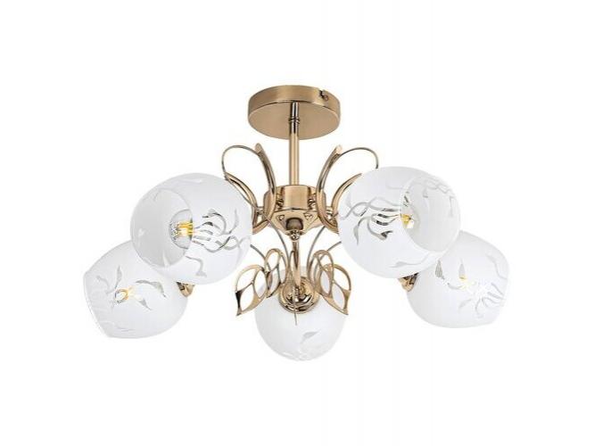 A klasszikus stílusú Fauna 5 izzós mennyezeti lámpa elegáns kiegészítője lesz hagyományos nappalijának vagy hálószobájának berendezésének. A mintás fehér üveg lámpabúrákat arany fémszerkezethez rögzítették. A lámpát egy kör alakú díszalap segítségével rögzíthetjük a mennyezethez. A gömbölyded, alulról nyitott lámpabúrákat a lámpa indaként csavarodó száraihoz rögzítették, amelyeket néhány arany levél díszít. A Fauna öt izzót használhat, mindegyik akár 40W teljesítményű lehet. A foglalat típusa E27. Ha meghitt, otthonos atmoszférát szeretne fokozni, válasszon melegfehér izzókat ehhez a lámpához. A Fauna 5 izzós mennyezeti lámpa méretei a következők: átmérő 560mm, távolság a mennyezettől 290mm, szerelési átmérő 120mm. Erre a modellre nincsenek fényforrások.