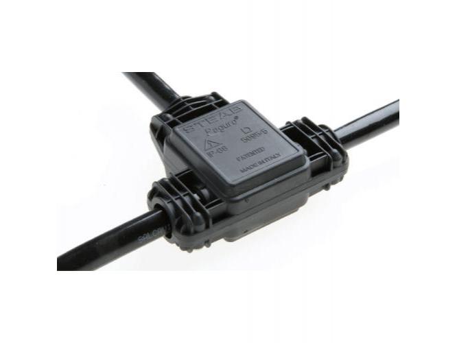 "T" alakú IP68-as csatlakozódoboz, speciális géltöltéssel, STEAB sorkapoccsal, 5 x 1.5 mm2-es fővezeték csatlakozással és 5 x 0.75 mm2-es elágazó csatlakozással.