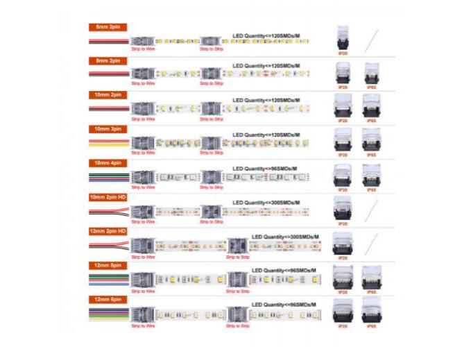 Mindez elérhető IP20-as változatban sima beltéri LED szalagokhoz, de IP65-ös változatban is a vízvédett LED szalagok toldásához, betáplálásához.
