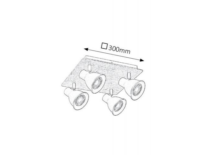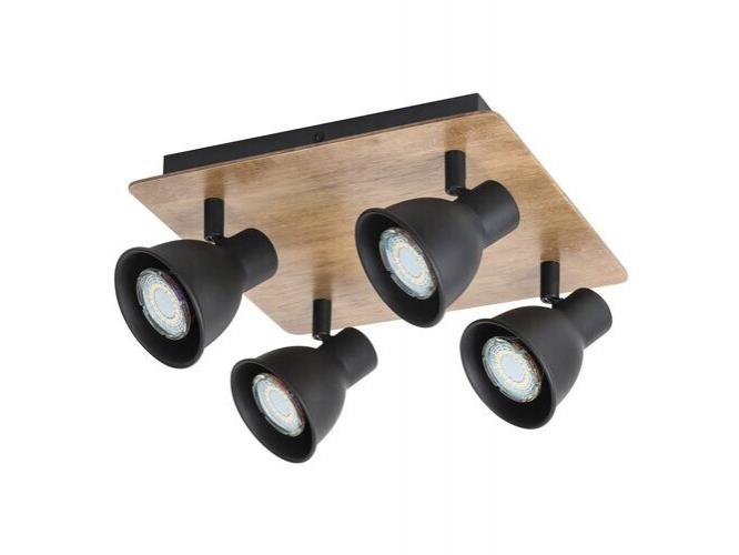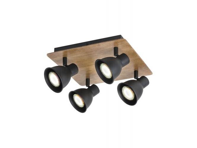 Ipari stílusú mennyezeti spotlámpa 4 foglalattal. 30 x 30 cm széles, fekete és bükk színű, fa hatású szerkezet. Helyzetbe állítható lámpaburával és IP20 védelemmel rendelkezik. A lámpatestben 4 energiatakarékos izzó is használható, melyek teljesítménye legfeljebb 35W, foglalat típusa GU10.