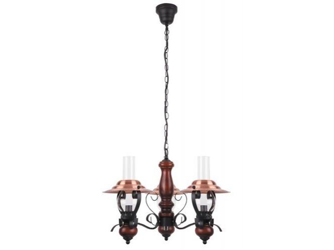 A csillár klasszikus stílusban és rusztikus kialakítással, 3 foglalattal. A lámpa fix, 98,5 cm-es rögzítéssel és 60 cm átmérővel készül, fekete színű fémből és dió színű fadíszítéssel, valamint réz színű fémből és üvegből készült lámpabúrákkal rendelkezik. A lámpa 3 x halogén vagy energiatakarékos fényforrásokat használhat akár 40W-ig, E14 foglalatokkal.