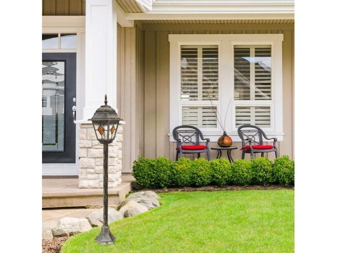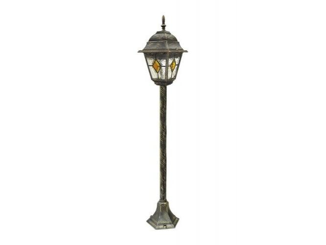 Egy klasszikus stílusú kültéri állólámpa 1 foglalattal. A 106 cm magas, 21 cm széles, antik arany színű fém lámpatestnek színes betét díszítésű üveg lámpabúrája és IP43 védettsége van. A lámpatestben akár 60W-ig terjedő energiatakarékos fényforrás is használható, E-27 foglalattal.