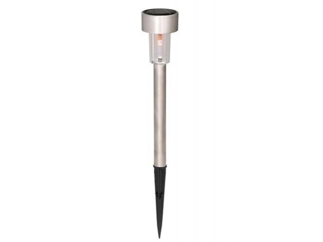 Kültéri napenergia lámpa, amelyet a földbe lehet ültetni, beépített LED fényforrással és akkumulátorral. 30 cm magas, rozsdamentes acél színű műanyag világítótest és fehér műanyag lámpabúra IP44 védelemmel a fröccsenő víz és por ellen. A világítótest nappali fényben nem működik.