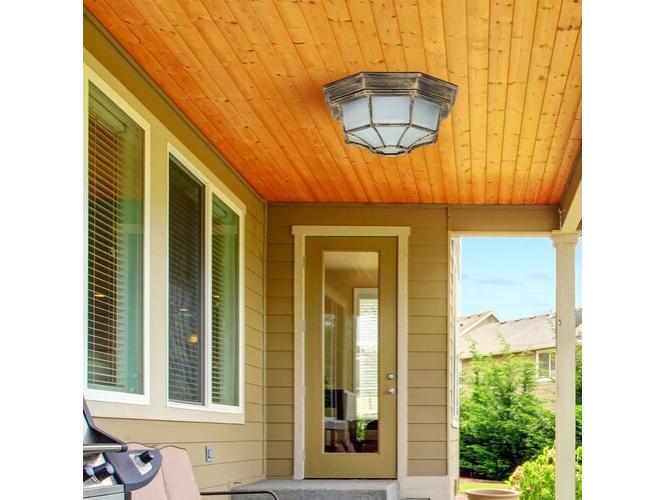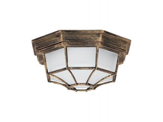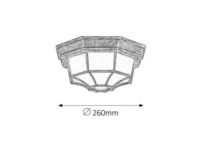 Egy klasszikus stílusú kültéri mennyezeti lámpa 1 foglalattal. Az antik arany színű fém lámpatest, melynek átmérője 26 cm, opálüveg lámpabúrával és IP43 védelemmel rendelkezik. A lámpatestben legfeljebb 100W teljesítményű fényforrás használható, E27 foglalattal.