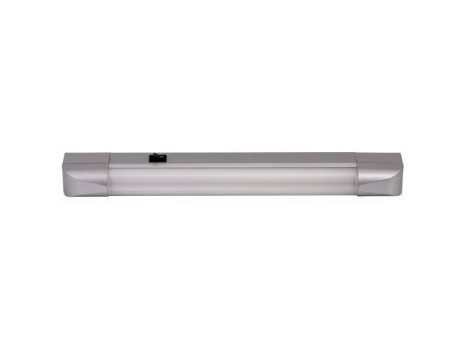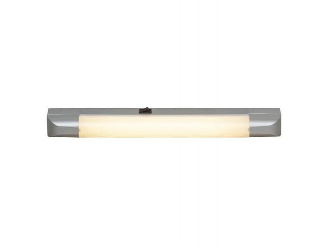 Egy modern stílusú fürdőszoba vagy szekrénymegvilágítás. A termék 1 db 10W-os, energiatakarékos fénycsővel van csomagolva, amelynek fényereje 630 lumen, és 2700 Kelvin meleg, fehér fényt ad. A fém és műanyag lámpatest ezüst színű, műanyag lámpabúrával rendelkezik, magassága 35 mm, szélessége 395 mm. Kapcsolóval könnyen kezelhető. A lámpa G13 foglalattal rendelkezik, és legfeljebb 10 W-os T8 típusú fényforrással használható.