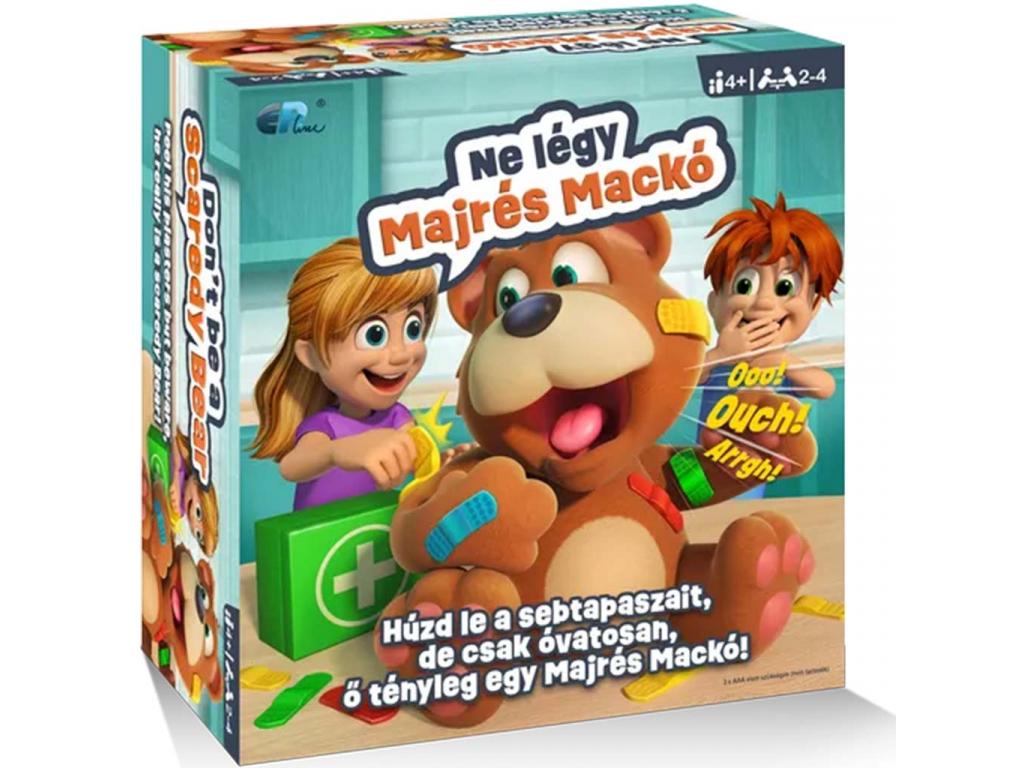 A Majrés Mackó társasjáték egy szórakoztató és izgalmas játék, amely garantáltan mosolyt csal a gyerekek arcára! Ebben a játékban a bátor kis játékosok feladata, hogy segítsenek a Majrés Mackónak megszabadulni a testét borító sebtapaszoktól. De vigyázat, Mackó igazán érzékeny, és ha valaki túl erősen húzza le a sebtapaszt, bizony felkiált és megijed! A játék lényege, hogy a játékosok ügyesen, óvatosan próbálják meg eltávolítani a színes sebtapaszokat, hogy Mackó nyugodt maradjon, és ne ijedezzen meg.
