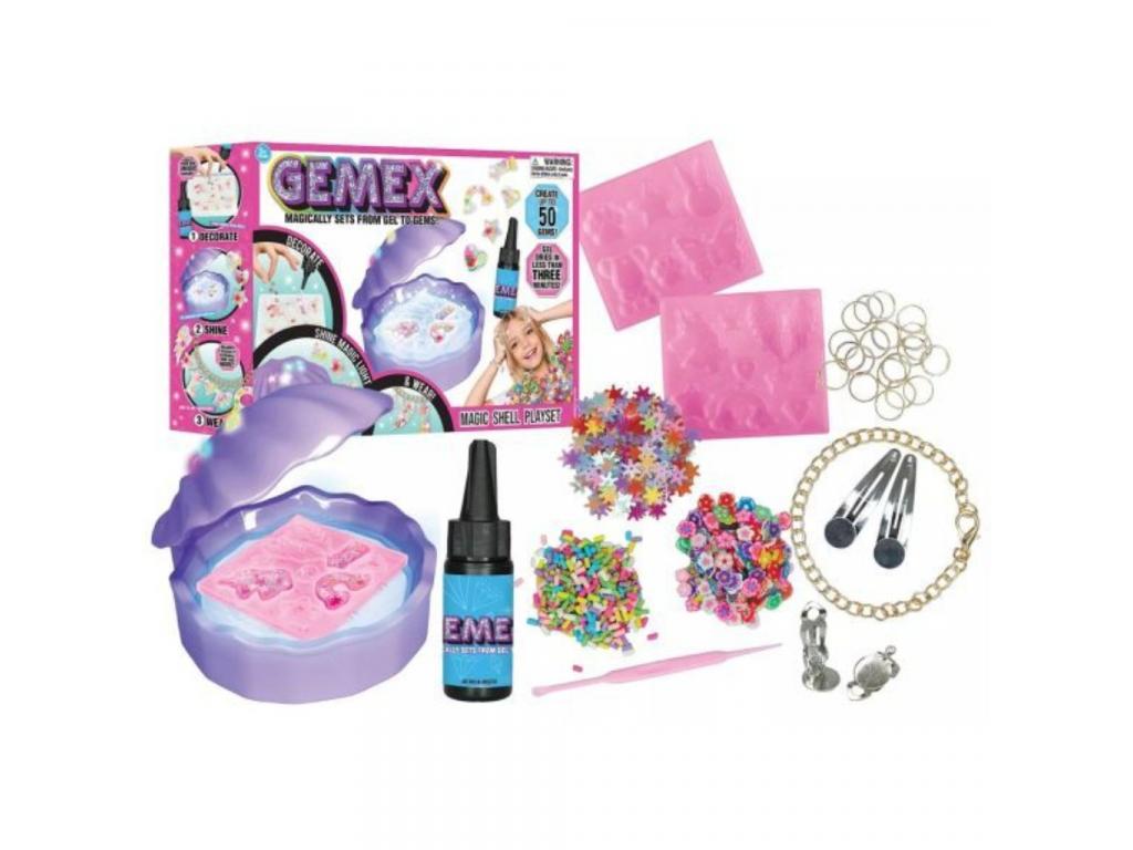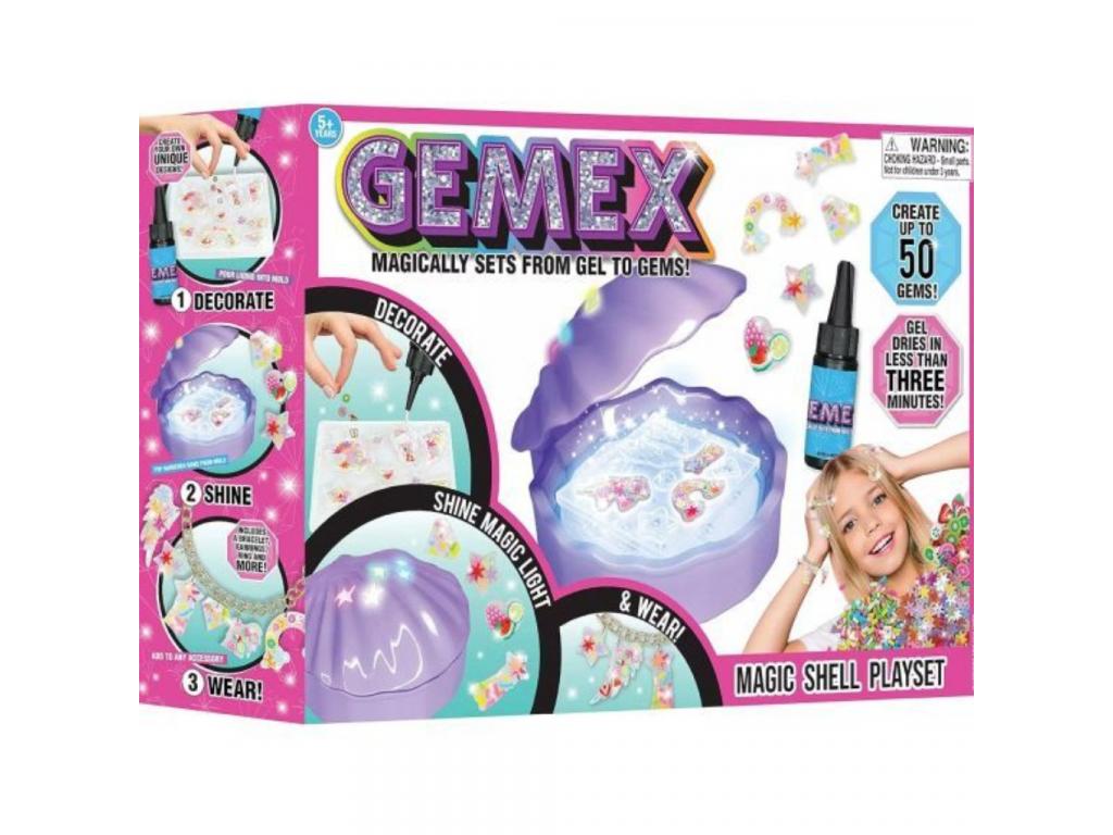 A Gemex: Gélből drágakő varázskagyló ékszerkészítő szett varázslatos élményt nyújt a gyerekeknek, amellyel valódi ékszereket alkothatnak gélből. A játék használata rendkívül egyszerű: a folyadékot az öntőformába kell önteni, majd különböző dekorációkat hozzáadni, és végül az egészet a varázslatos kagylóba helyezni. Itt, mindössze 3 perc alatt, a gél megszilárdul, és kész is az egyedi műanyag ékszer. A gyerekek így akár 50 különleges ékszert is készíthetnek, melyeket viselhetnek, vagy ajándékba adhatnak.
