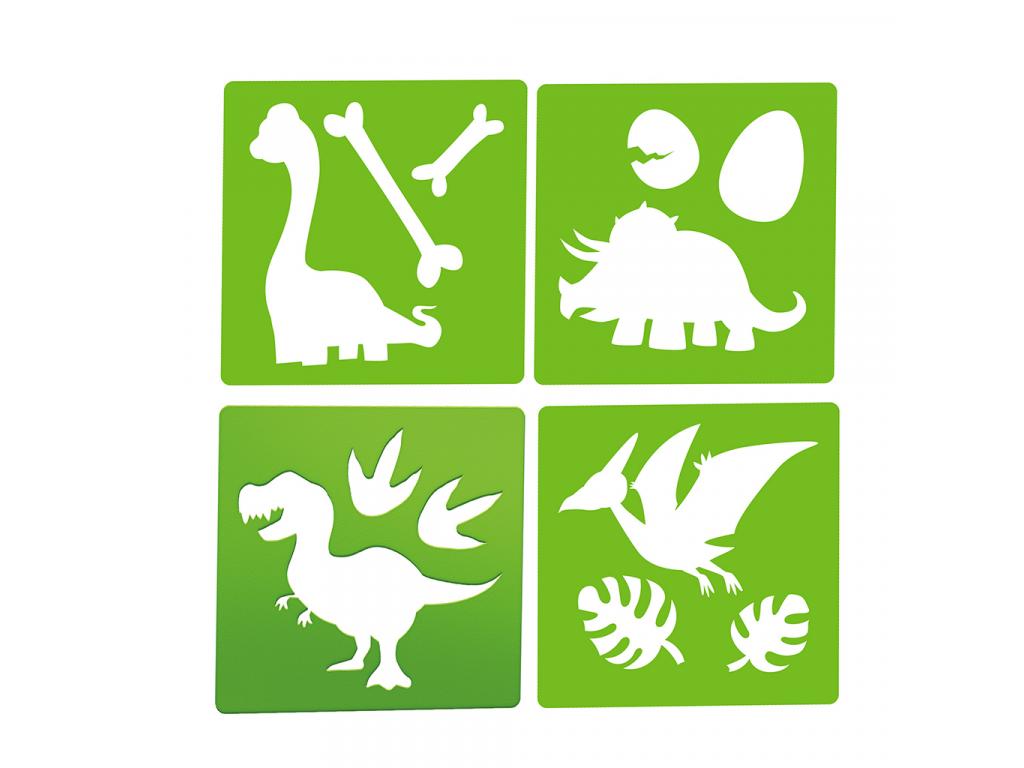 A szett különlegessége a 4 darab dinoszauruszos sablon, melyek segítségével könnyedén megjeleníthetők a legnépszerűbb őslények, mint a Brachiosaurus, Triceratops és a T-rex. A sablonokkal a rajzolás egyszerű és szórakoztató, lehetővé téve a gyerekek számára, hogy pontosan és könnyedén alkossanak látványos dinoszauruszokat.