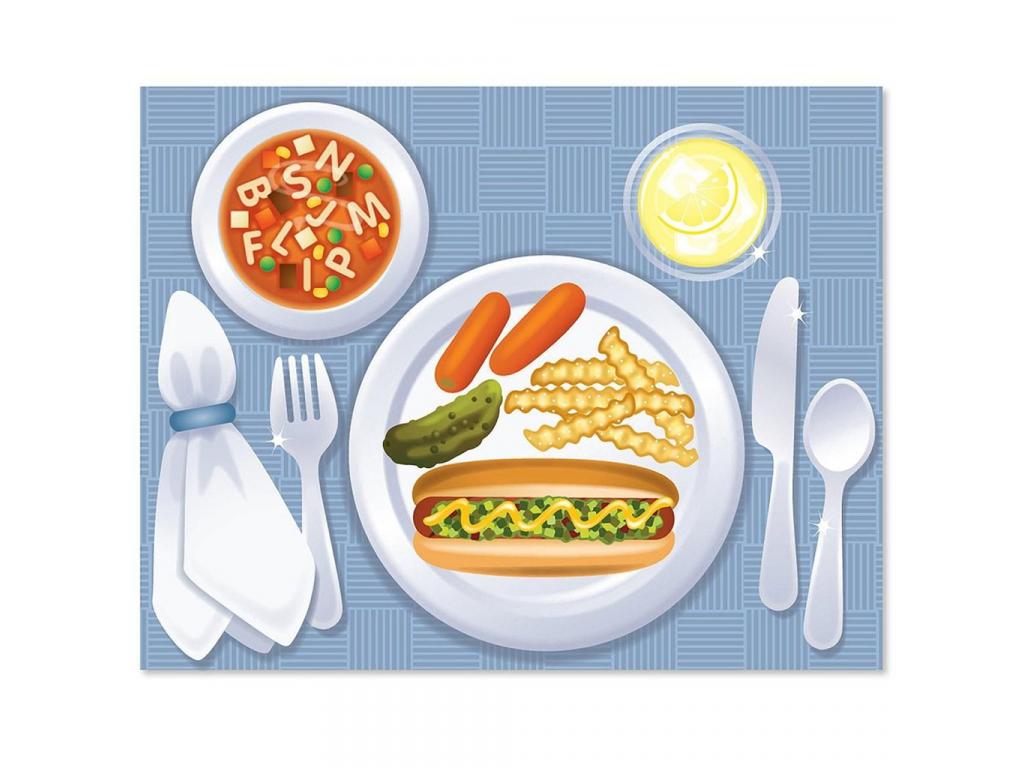 A készlet 15 előre megterített tányért biztosít, amelyek különböző stílusú asztalterítékekkel vannak ellátva, így a gyerekek nemcsak a megfelelő ételeket választhatják ki, hanem akár egy elegáns vacsora vagy egy vidám uzsonna jelenetét is megalkothatják. A különböző ételek, mint a pizza, szendvicsek, palacsinta, gyümölcsök, sütemények és sok más ízletes finomság közül válogathatnak, és újra meg újra elrendezhetik azokat, mivel a matricák könnyedén visszaszedhetők és áthelyezhetők.