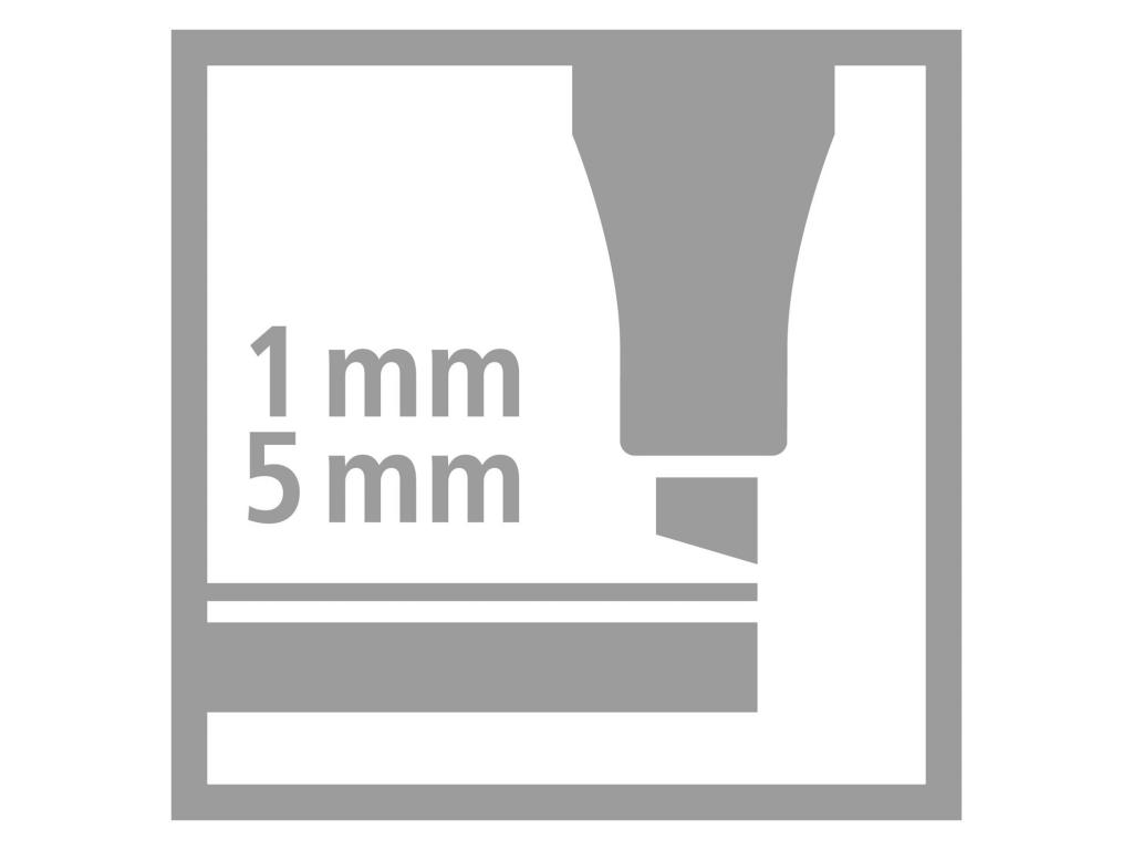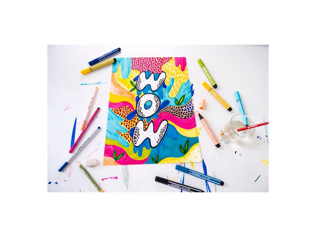 A ferde hegy 5 mm és 1 mm széles vonalakhoz egyaránt használható, és tökéletesen alkalmas durva és merész vázlatokhoz és nagy területek színezéséhez, de éles élek és pontos kontúrok létrehozásához is. nagy területek rajzolásához és színezéséhez, de éles élek és pontos kontúrok létrehozásához is. A hobbiművészek és a kreatív szakemberek egyaránt értékelik a STABILO Pen 68 MAX által kínált széleskörű lehetőségeket: Festés, rajzolás, absztrakt minták, kézi betűírás, újságírás és még sok más. A vízbázisú tintának köszönhetően a lélegzetelállító akvarellhatású műalkotások létrehozása gyerekjáték. A 12 órás száradásvédelemnek köszönhetően a STABILO Pen 68 MAX nem szab időbeli korlátot semmilyen kreatív projektnek.