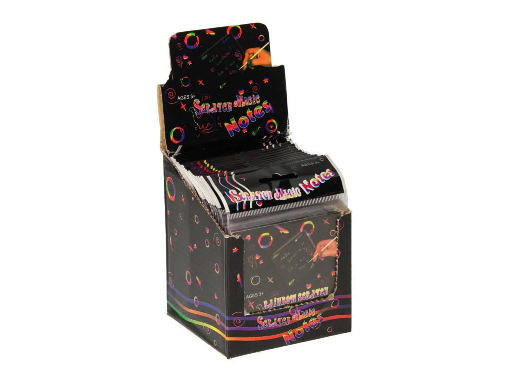 Fekete kaparós sorsjegyek szivárványszínű háttérrel. Karcold meg a kártyák egyik rétegét a karcolótollal, és megjelennek a szivárvány színei. Tartalom: 24 x 24 kaparókártya és a hozzá tartozó kaparótoll.