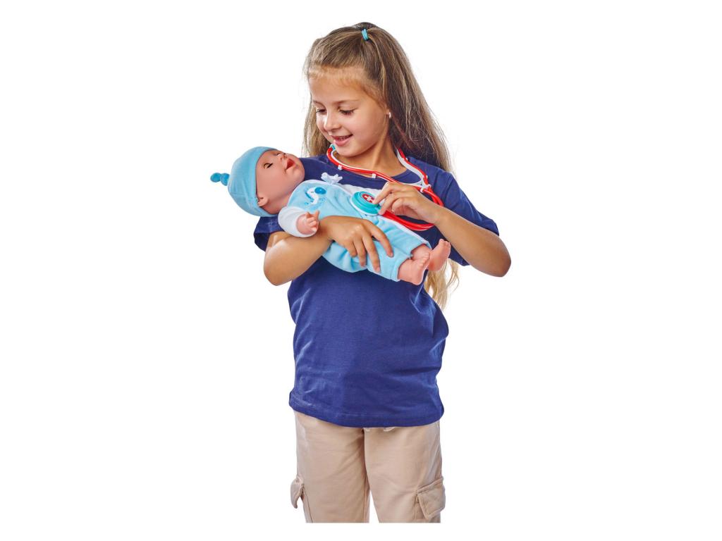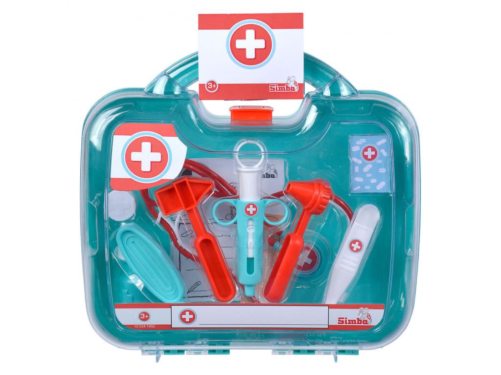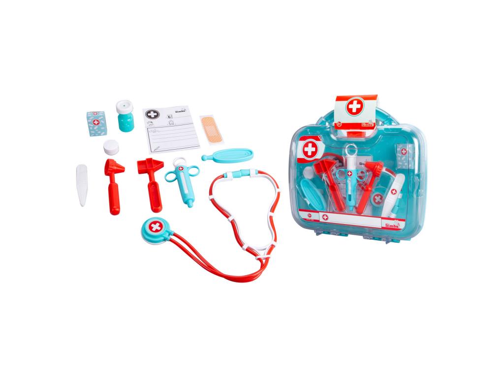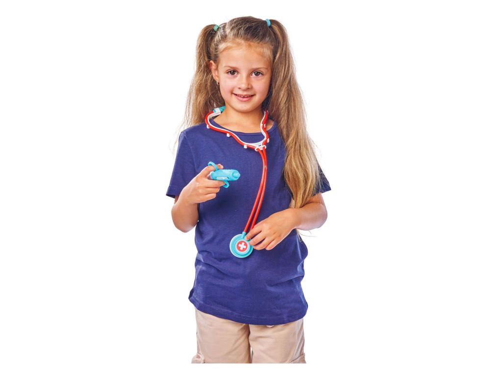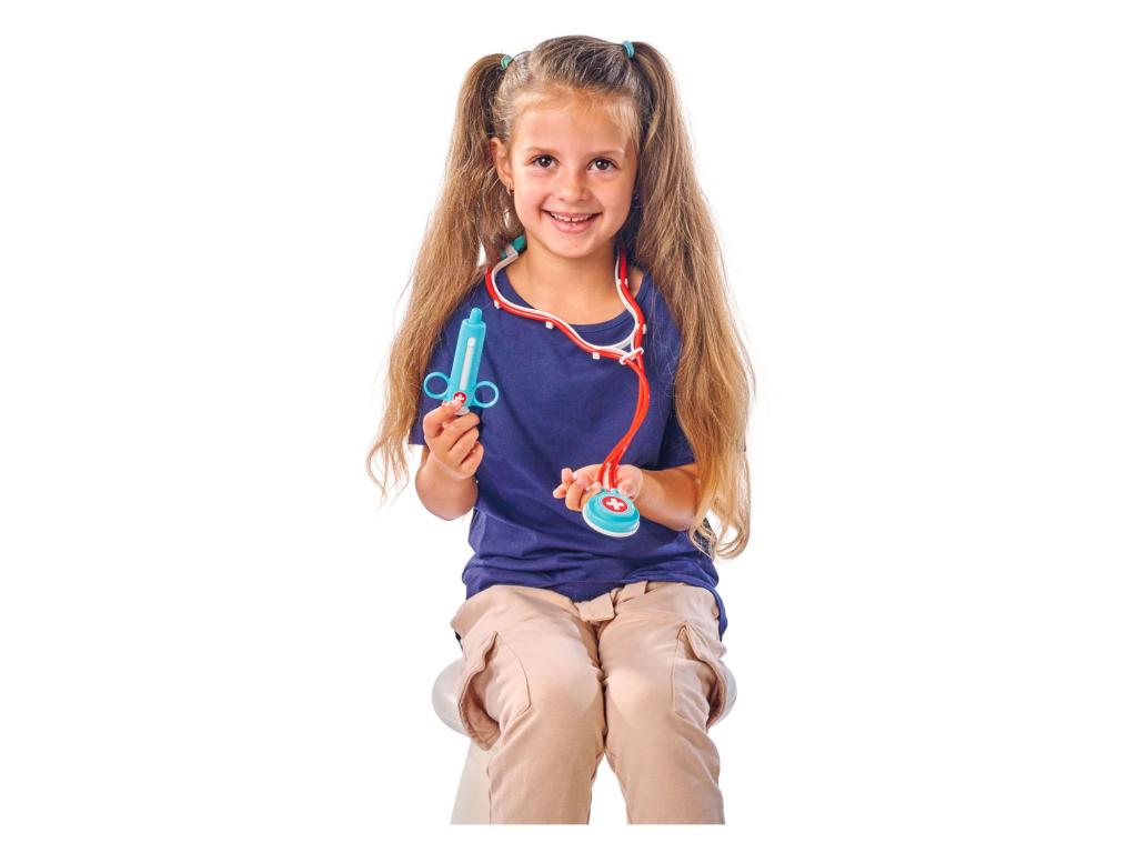 Műanyag orvosi táska 12 tartozékkal, köztük sztetoszkóppal, orvosi levéllel, lázmérővel és gipsszel. Alkalmas 3 éves kortól.