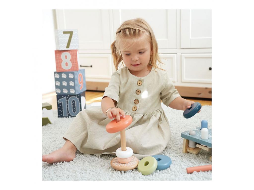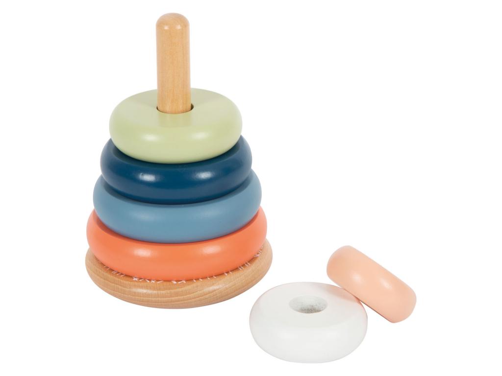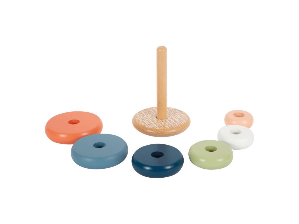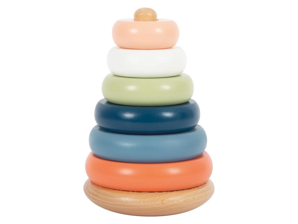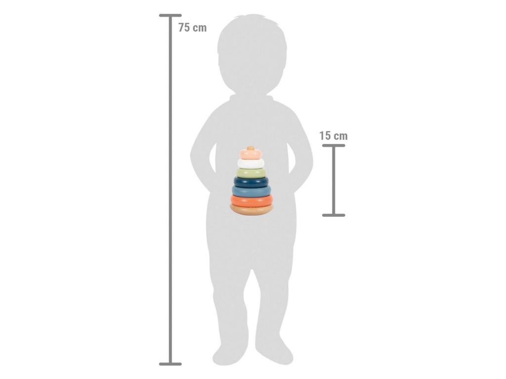 Rakosgatós és formázós móka sarkvidéki hangulatban! Ez a 100%-ban FSCŽ minősítésű fából készült, egymásra rakható torony még a legkisebbeket is motiválja, hogy a hat különböző színű gyűrűt méret szerint rendezzék és egymásra rakják. Ez a tevékenység edzi a motorikus készségeket és a szem-kéz koordinációt, valamint betekintést nyújt a színek és méretek megismerésébe. A lekerekített alapnak köszönhetően az egymásra rakosgatható torony előre-hátra inog, játékos módon kihívást jelentve a gyermekek mozgékonyságára. A mozgatható csap további biztonságot nyújt. Ez a gyermekbarát, klasszikus motorikus készségfejlesztő játék robusztus fából készült, modern, mégis finom színekben pompázik, és garantálja a hosszan tartó játékélményt. A fa sima tapintású, és kellemes tapintási élményt nyújt. A kisgyermekek soha nem fogják megunni! Méretek: Magasság: kb. 30 cm 15 cm, O kb. 10 cm. Alkalmas 12 hónapos kortól.