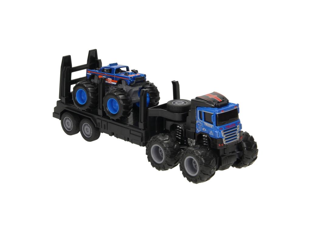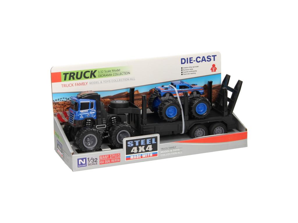 Öntött terepjáró monster truckkal a pótkocsin. Méretarány 1:32.