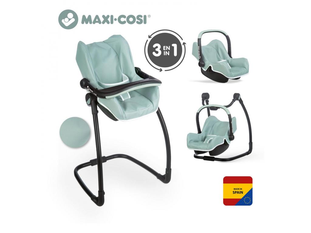 3 az 1-ben Maxi-Cosi babák a Smoby + Maxi-Cosi cégtől zsályazöld színben. Autósülésből babaszék étkező tálcával és hintaszékkel. Robusztus műanyagból készült és praktikus állítható fogantyúval rendelkezik. A hordozható autósülésbe 42 centiméteres magasságig babák is beférnek. Alkalmas 3 éves kortól és idősebb gyermekek számára.