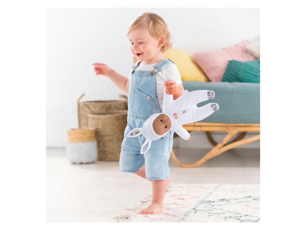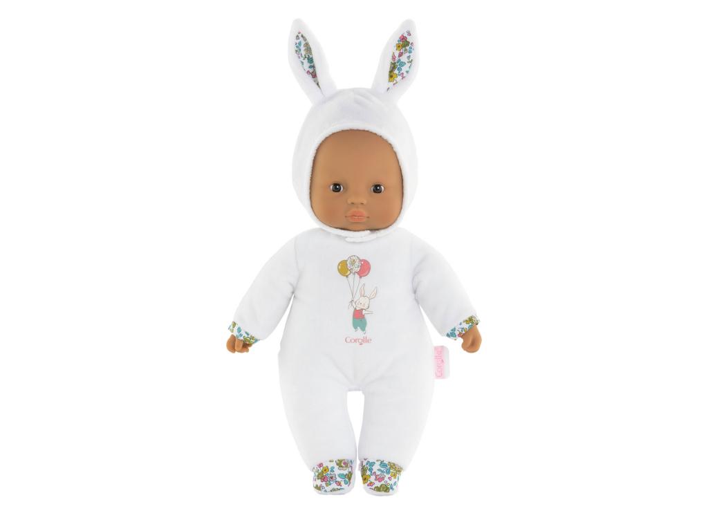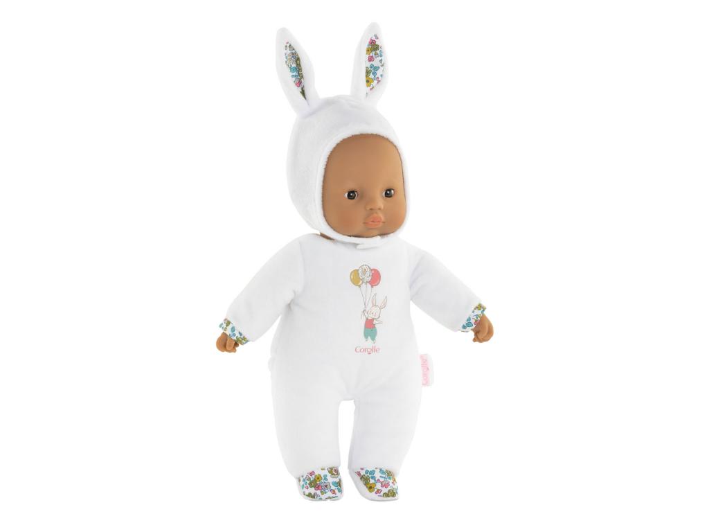 Puha, fehér ruhával, nyuszifülekkel, vinil arcocskával és kezekkel ellátott ölelgetős baba a Corolle-tól. A baba a jellegzetes Corolle vanília illattal és név/telefonszám felirattal rendelkezik. Alkalmas 9 hónapos és idősebb gyermekek számára.
