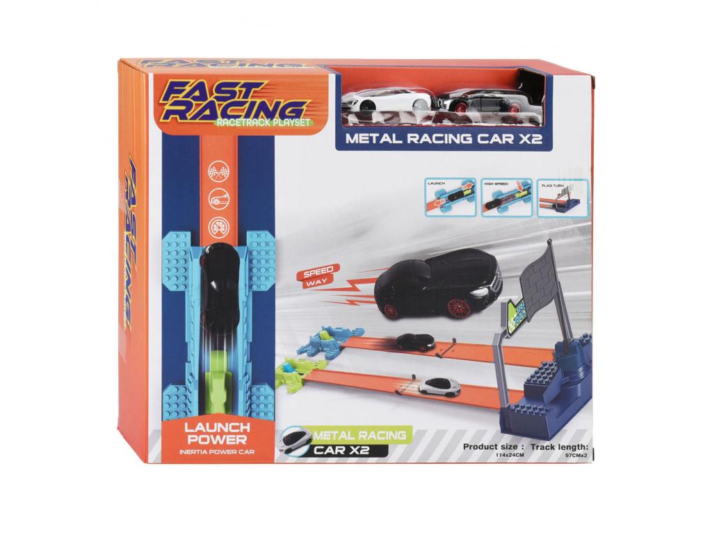 Versenypálya játékkészlet két egymás melletti versenypályával, 2 fém autóval és egy kockás zászlóval, amely a célt jelzi. Pálya hossza: 2x 97 centiméter. 6 éves kortól alkalmas.