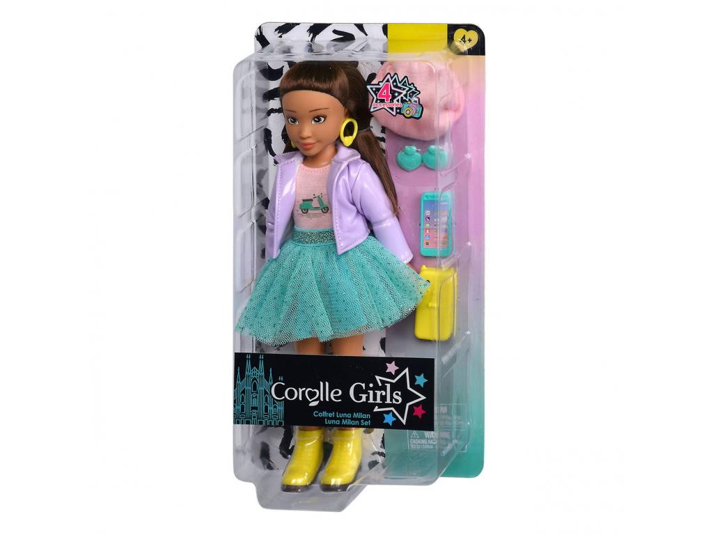 A Luna Fashion Week Milan szett Lunát, egy 28 cm magas divatbabát és 4 kiegészítőt tartalmaz: 1 pár levehető fülbevalót, 1 mobiltelefont, 1 mobiltelefon-takarót és 1 barettet. Lunának természetes arca van, a Corolle-ra jellemző vaníliaillattal és finom arcvonásokkal. Szemei festettek, és hosszú barna haja van. Viselete: 1 tüllszoknya, 1 póló, 1 kabát, 1 pár levehető bokacsizma és 1 pár levehető fülbevaló. Luna élethű tinédzser teste van. Önállóan ül és áll. A Corolle Girls többféle modellben kapható, és öltözködési lehetőséggel rendelkezik a még nagyobb szórakozás érdekében. Corolle lányok; a legjobb barátaim! Alkalmas 4 éves kortól.