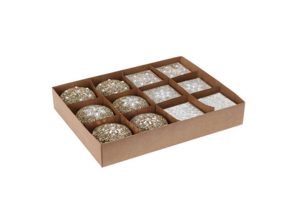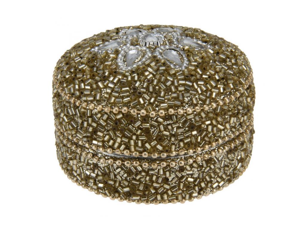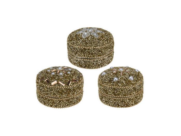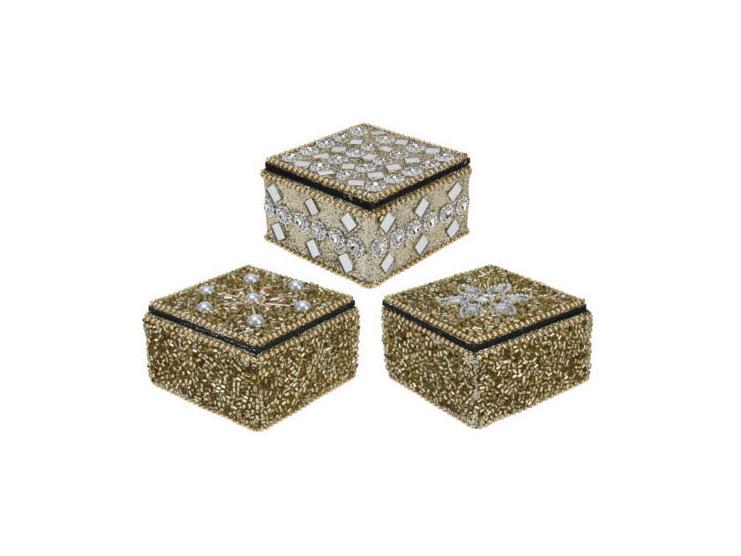 12 darab aranyszínű tárolódobozból álló készlet (4 x 3 centiméteres méretben) fedelekkel. A dobozokat gyönyörű strasszkövek, műgyöngyök és gyöngyök díszítik. A készlet 3 különböző kerek és 3 különböző négyzet alakú mintát tartalmaz.