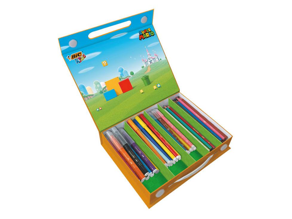 BIC Kids Super Mario színező tok 30 színes ceruzával, 12 rendkívül jól radírozható filctollal, 10 színes ceruzával, 18 normál színes ceruzával és matricás lapokkal az összes Super Mario figurával.