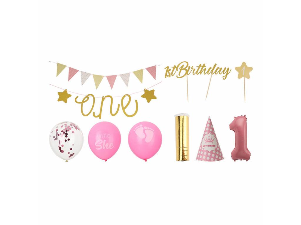 Party dekorációs készlet 1. születésnapra - rózsaszín/lányok, 9 db.