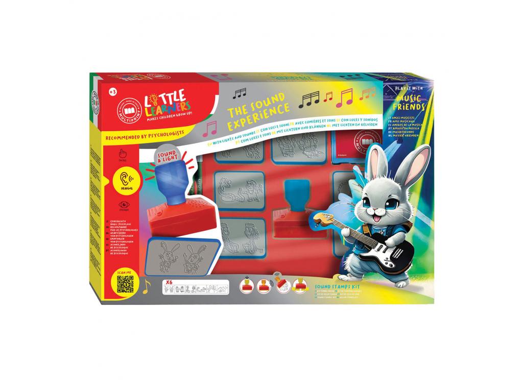 "Zenélő állatok" bélyegzőkészlet fénnyel és hanggal. Tartalom: 1 bélyegzőtartó, 6 kattanó bélyegző, 1 tintapárna, 10 filctoll és rajzpapír. Alkalmas 3 éves kortól.