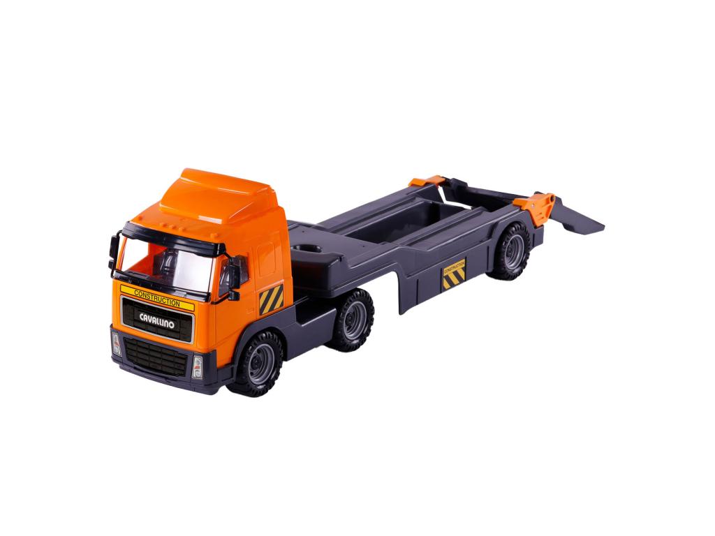 Ennek a hatalmas teherautónak hosszú pótkocsija van, amelyen egy lapát is elfér. Az ásó könnyedén áthalad a rakodórámpán a teherautóra. Emelje fel a hátsó ajtót, és lépjen a gázra! A teherautó elviszi az ásót az építkezés helyszínére, ahol megkezdheti a munkát. A teherautó és a kotrógép narancssárga és fekete színű. A Cavallino sorozat többi munkagépével együtt ezzel a teherautóval különösen szórakoztató játszani. Részletek - Méretek: 75,5 x 21,5 x 32 cm. - Méretarány: 1:16 - Anyag: műanyag. - Alkalmas 1 éves kortól.