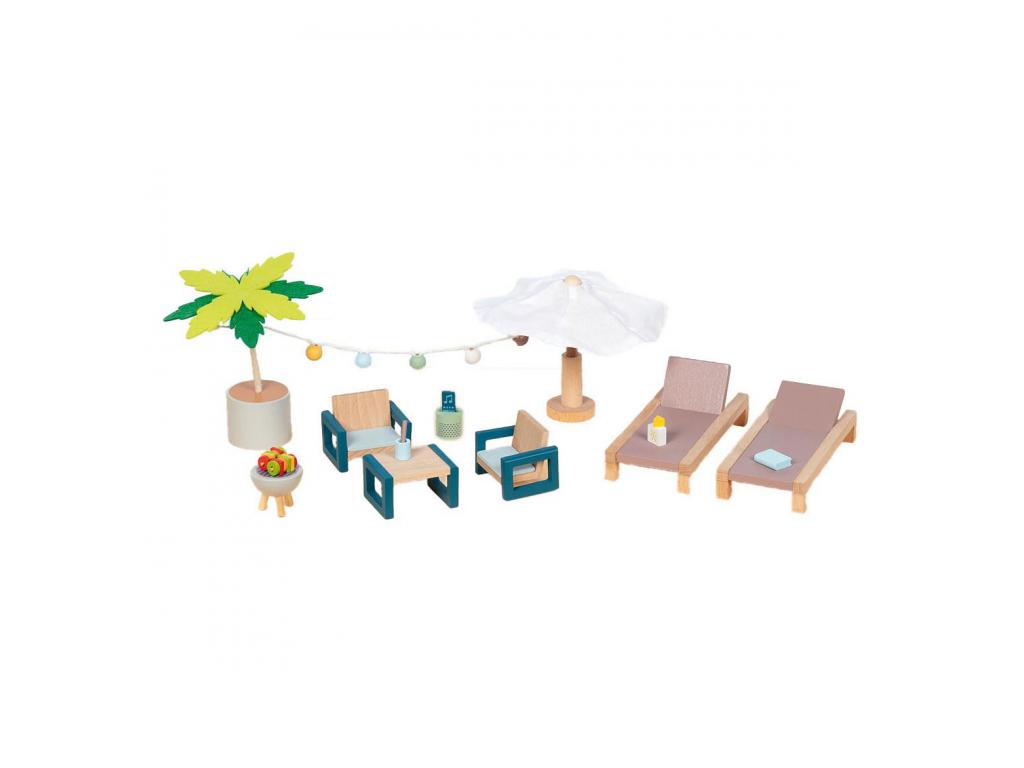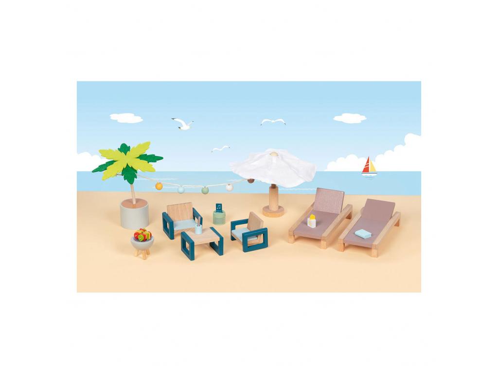 Ahogy összeszereled ezt a bababútor-készletet, szinte hallod a hullámok hangját. Ez a modern kültéri bababútor tiszta nyaralási hangulatot áraszt. Ne feledkezz meg a naptejről, miközben a napozóágyon pihensz, vagy a társalgóban eszel valamit! Tulajdonságok - Ajánlott életkor: 3+ - Anyag: fa, anyag - Darabszám: 17 - Méretek: 13 x 6 x 2,2 cm.