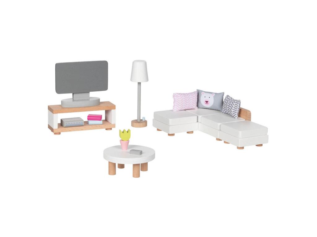 Stílusos, modern kialakítású bútorzat a babaház nappalijába. Minden Goki babaházhoz alkalmas. Tulajdonságok - Goki fából készült babaház bútor a nappaliba - 15 darabból - Fából, szövetből készült - Méretek: 9,5 centiméter - 3 éves kortól alkalmas.