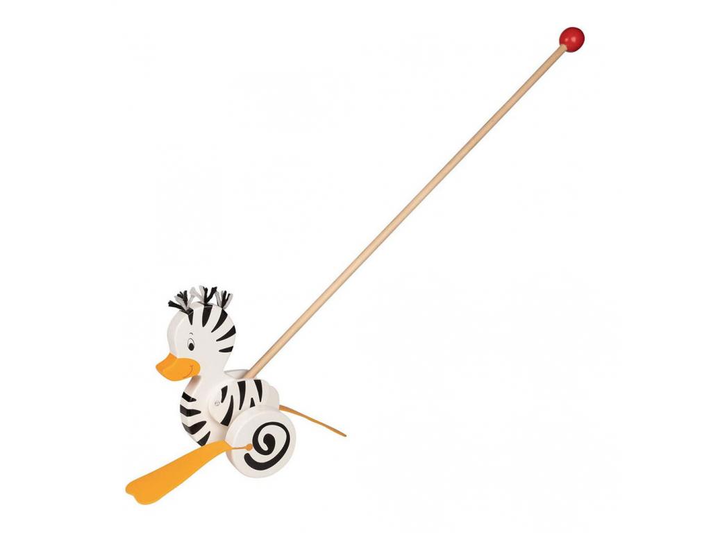 Minden ecsetvonásnak tökéletesnek kell lennie ahhoz, hogy a tologatható állatnak ezt az élénk, szeretetteljesen pimasz kifejezést kölcsönözze. A pólyás lábak az állatnak a teljesen tipikus kacsajárást adják, ami a zebrakacsa mozgó szárnyaival együtt olyan élénkséget kölcsönöz neki, amely a tömörfa játékoknál kivételes. Tulajdonságok - Ajánlott életkor: 1+ - Anyag: fa - Méret: 20,5 cm