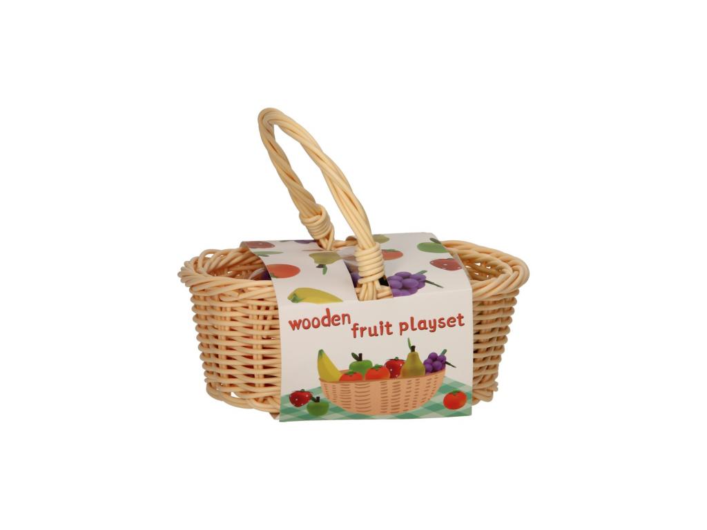 Fából készült gyümölcsök fonott piknikkosárban. Tartalom: 1 piknikkosár, 1 banán, 1 körte, 1 eper, 1 alma, 2 mandarin és egy fürt 9 szem szőlő.
