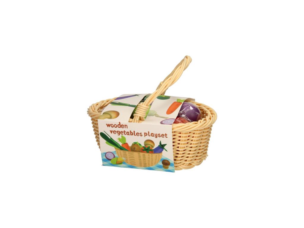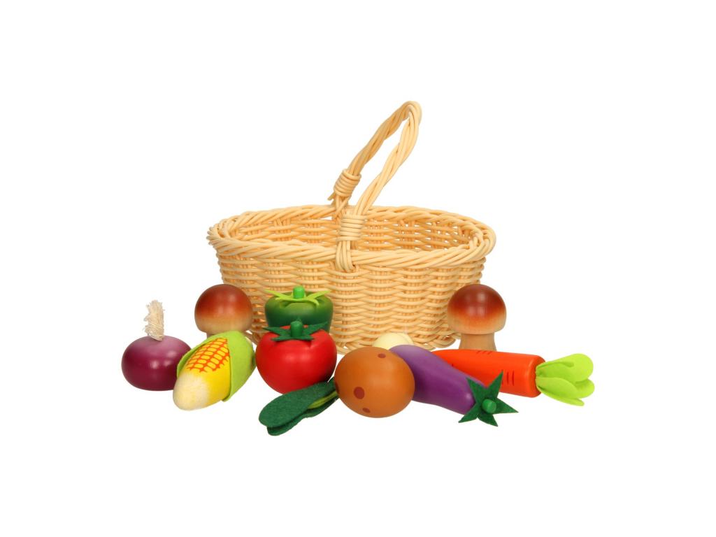 Fából készült zöldségek fonott piknikkosárban. 11 darab, azaz 1 gyümölcskosár és 10 zöldség.