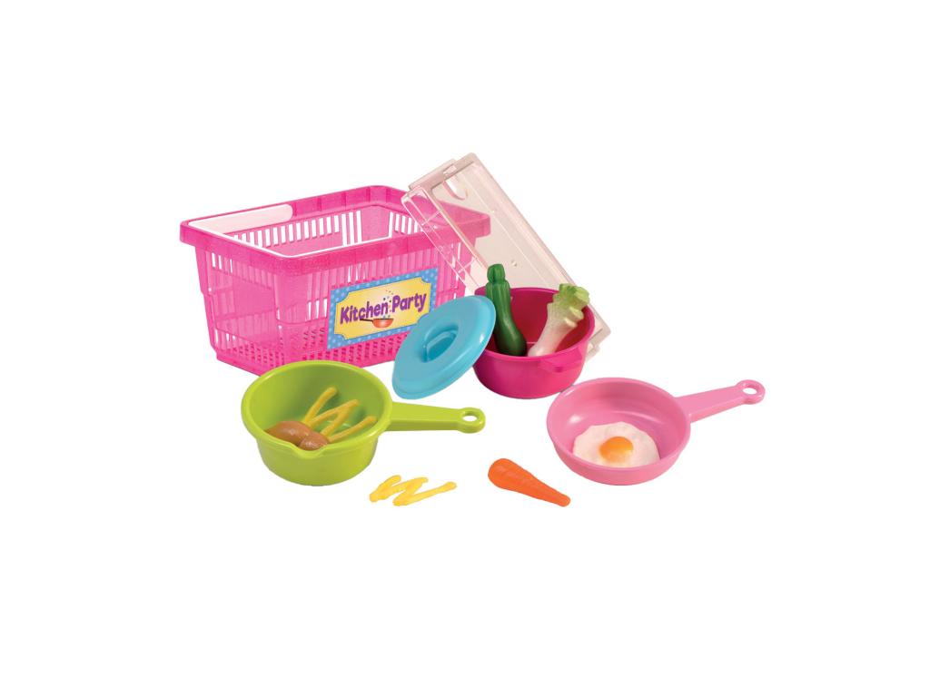 Rózsaszín színű, fedeles bevásárlókosár, amely 3 edényt és különféle játékételeket tartalmaz. Műanyagból készült. Méretek: 23 x 16 centiméter. Alkalmas 3 éves kortól.