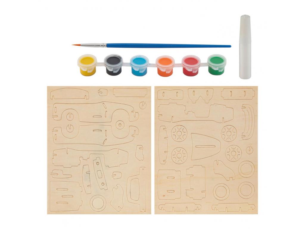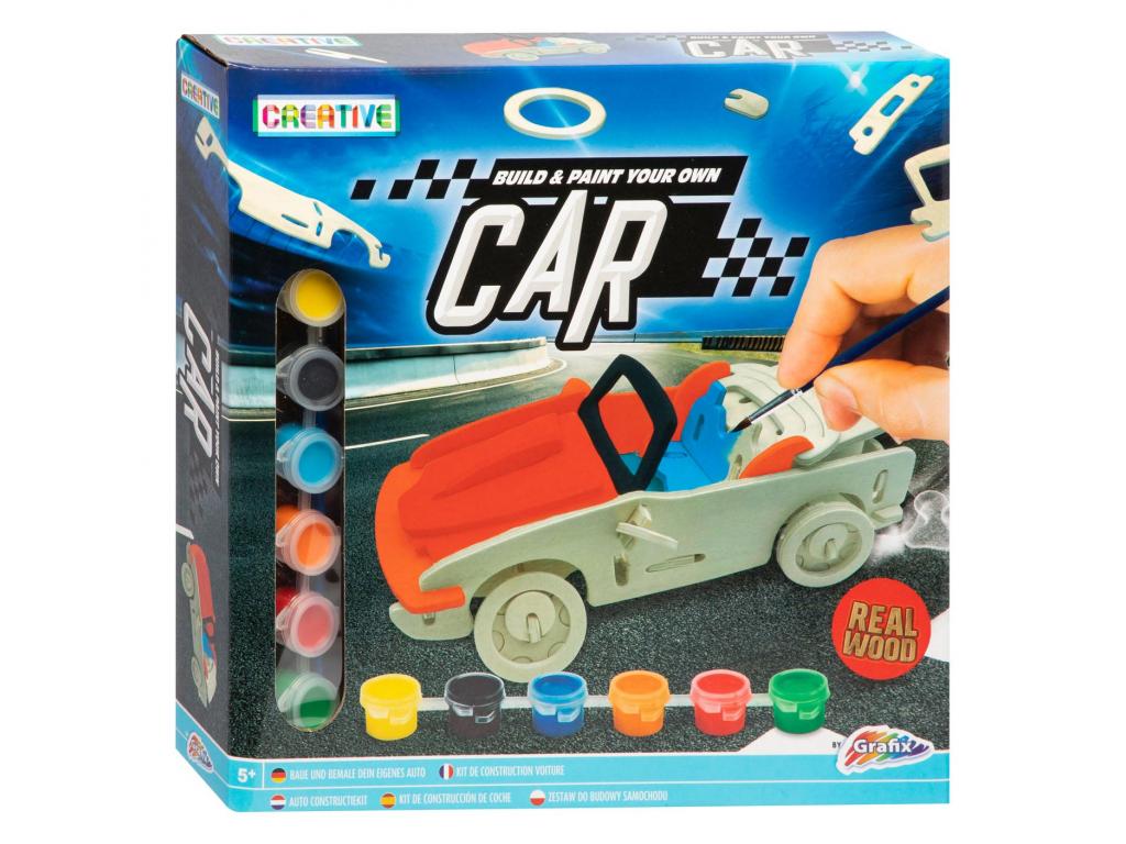 Építő- és festőkészlet saját faautó építéséhez. Rakd össze az alkatrészeket, és fesd le tetszésed szerint. Ez a készlet 6 festékes tégelyt és egy ecsetet tartalmaz. Fából készült, és 5 éves kortól alkalmas.
