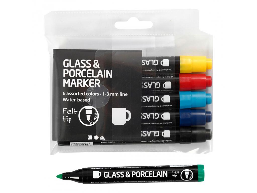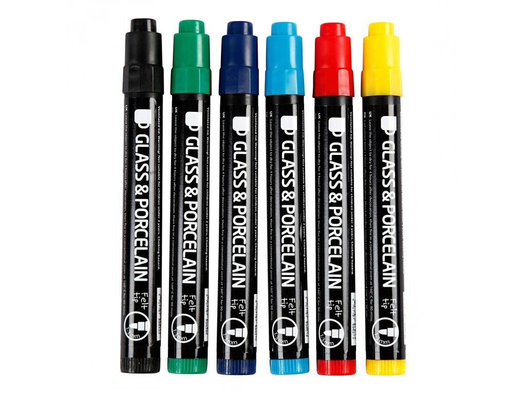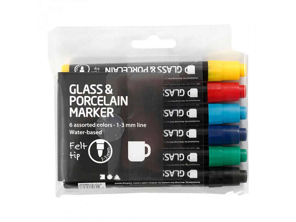 Félig átlátszatlan, vízbázisú filcmarker szilárd filcheggyel üveghez és porcelánhoz. A sütőben való megszilárdulás után a termék enyhe mosogatógépben mosogatható. Ha üveg- és porcelánmarkerekre van szüksége, ezeket mindenképpen ajánljuk, sokféle kreatív projekthez alkalmasak, és gyerekek is könnyen használhatják. Ha saját üveg- vagy porcelándarabot szeretne díszíteni, a felületnek tisztának és zsírmentesnek kell lennie, és az elkészült darabot négy órán át kell száradni hagyni. Ezután tegye hideg sütőbe, állítsa be a hőmérsékletet 160 fokra, és hagyja 90 percig keményedni.