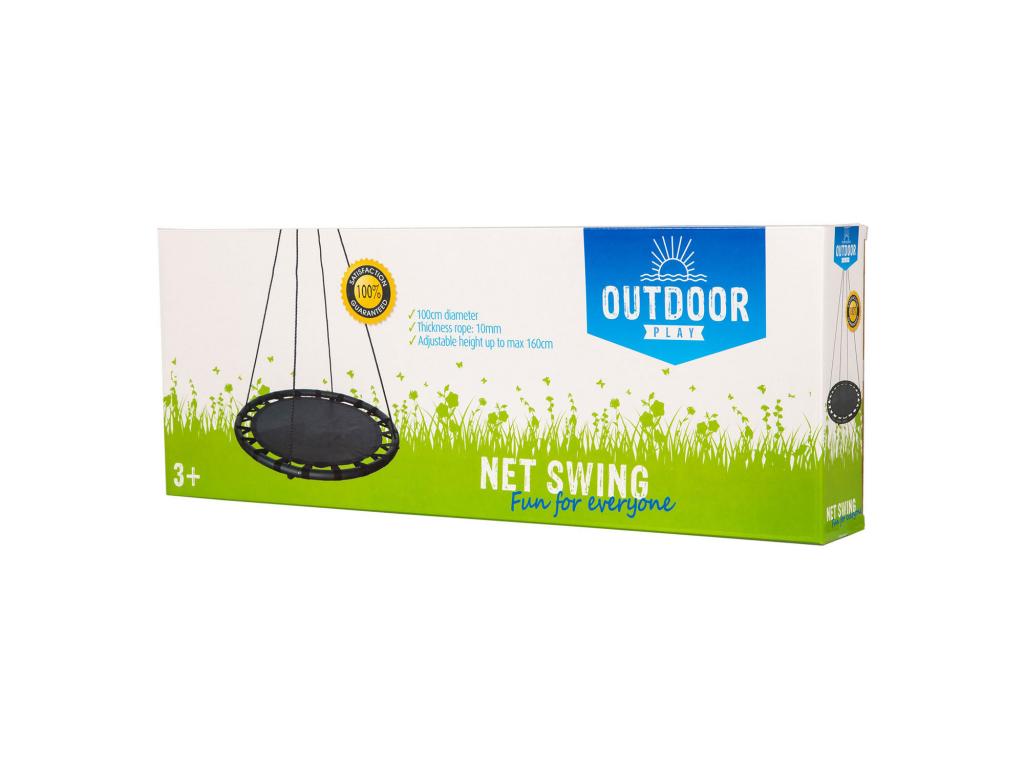 Kültéri játékháló hinta. Kényelmesen hintázhatsz ezzel a kültéri Play! Átmérője 100 cm, terhelhetősége pedig 100 kg. A felfüggesztőkötél maximum 160 cm-ig állítható, és 10 mm vastag. A fekete szőnyeg szilárdan rögzítve van a 0,8 mm vastag acélból készült, 25 mm átmérőjű acélcsövekhez, amelyeket fekete habszivacs véd. Színes dobozban, részletes használati útmutatóval együtt szállítjuk. Alkalmas 3 éves kortól.