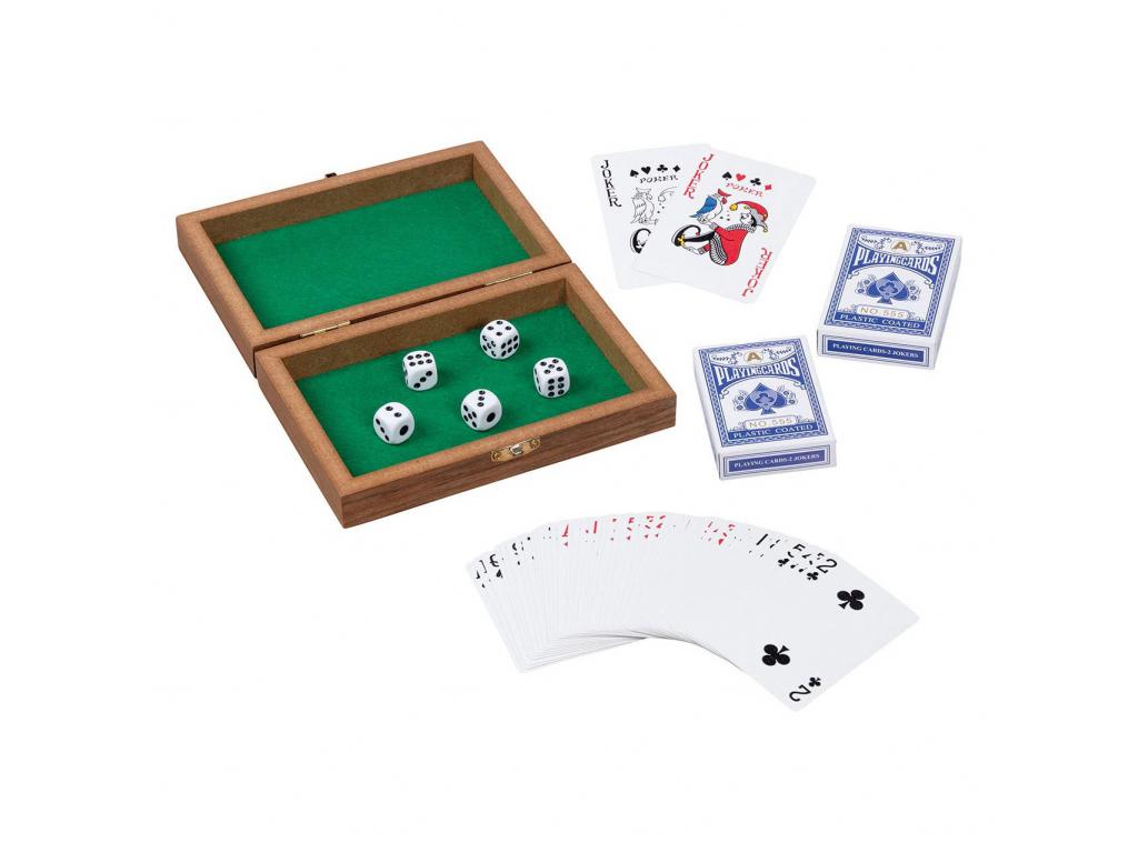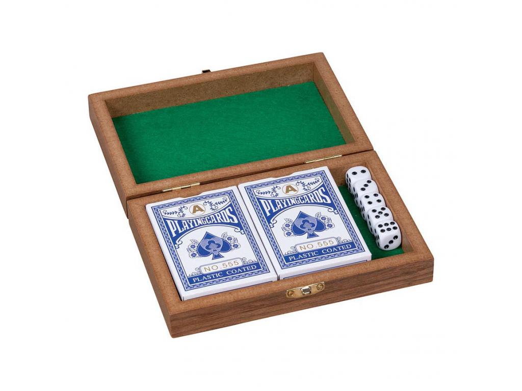 A Goki fából készült játékkártya doboz 5 kockával és 2 csomag kártyával leírása: