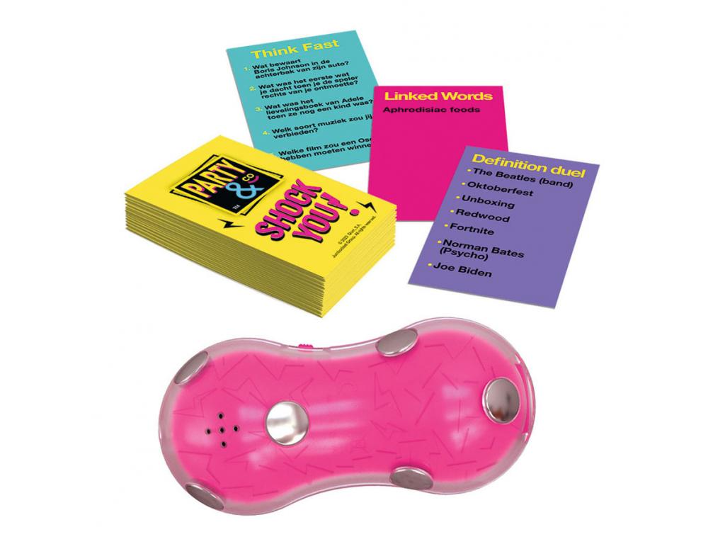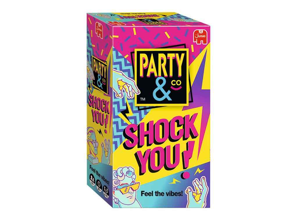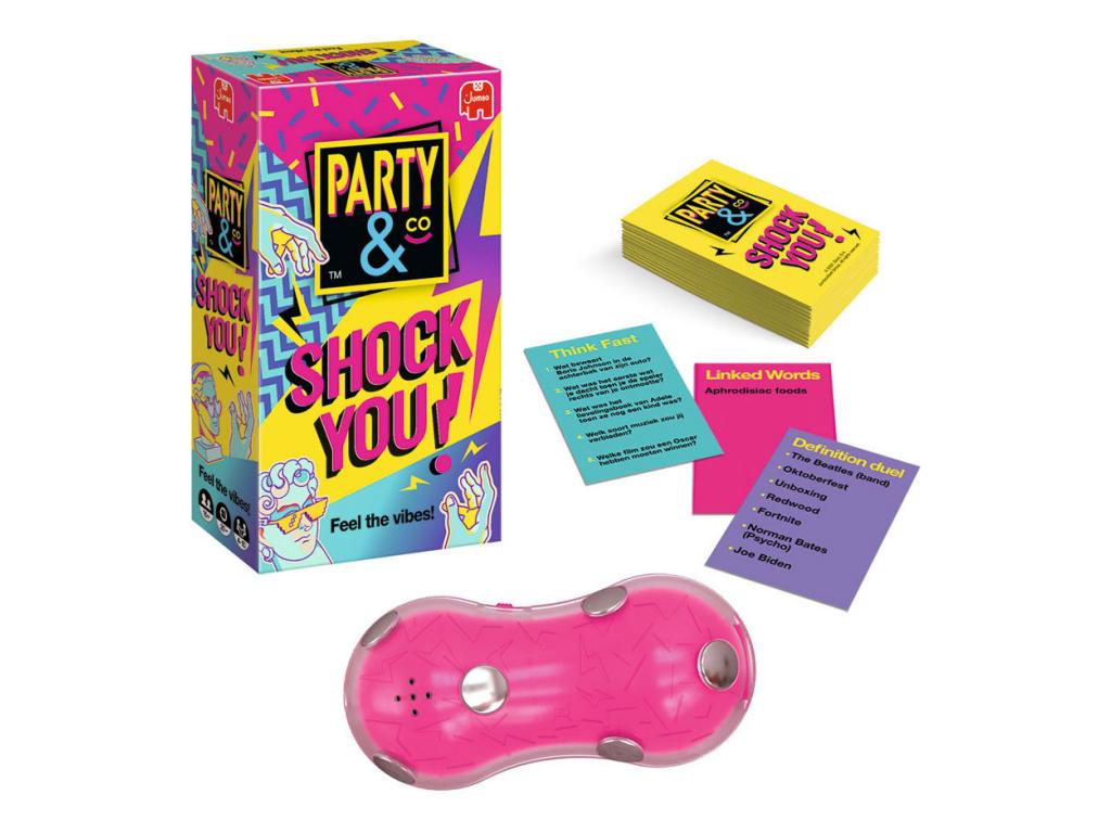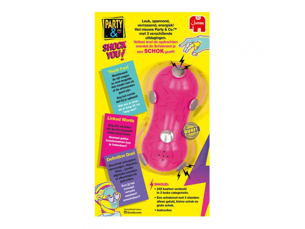 Szórakoztató, stresszes, meglepő és dinamikus ... az új Party & Co. sokkol téged! A játékban 3 különböző kihívás és véletlenszerű idő áll rendelkezésre. A cél az, hogy teljesítsd a teszteket, mielőtt a sokkoló idő lejár és bekövetkezik a sokk. A sokkolóanya három fokozatban játszható: nincs sokk, gyenge sokk vagy közepes sokk. Megjegyzés: A termék által kibocsátott áram nem káros az emberi szervezetre. A játékszabályok: Ossza a játékosokat két csapatra. Helyezze a "Shocknut"-ot és a kártyapaklit a játéktér közepére. Válassza ki, melyik csapat kezd. A játék: A soron lévő csapat egyik játékosa elvesz egy kártyát, és felolvassa, hogy mi áll rajta. Nyomja meg a "Sokknut" lapon lévő gombot. A feladat indításához háromféle feladatkártya van: "Gondolkozz gyorsan", "Összekapcsolt szavak", "Definíciós párbaj": Az a csapat, amelyik teljesíti a feladatot, mielőtt a "Sokknóta". kialszik, megtarthatja a kártyát. Ki nyer? Az a csapat nyer, amelyiknek először van 7 kártyája.
