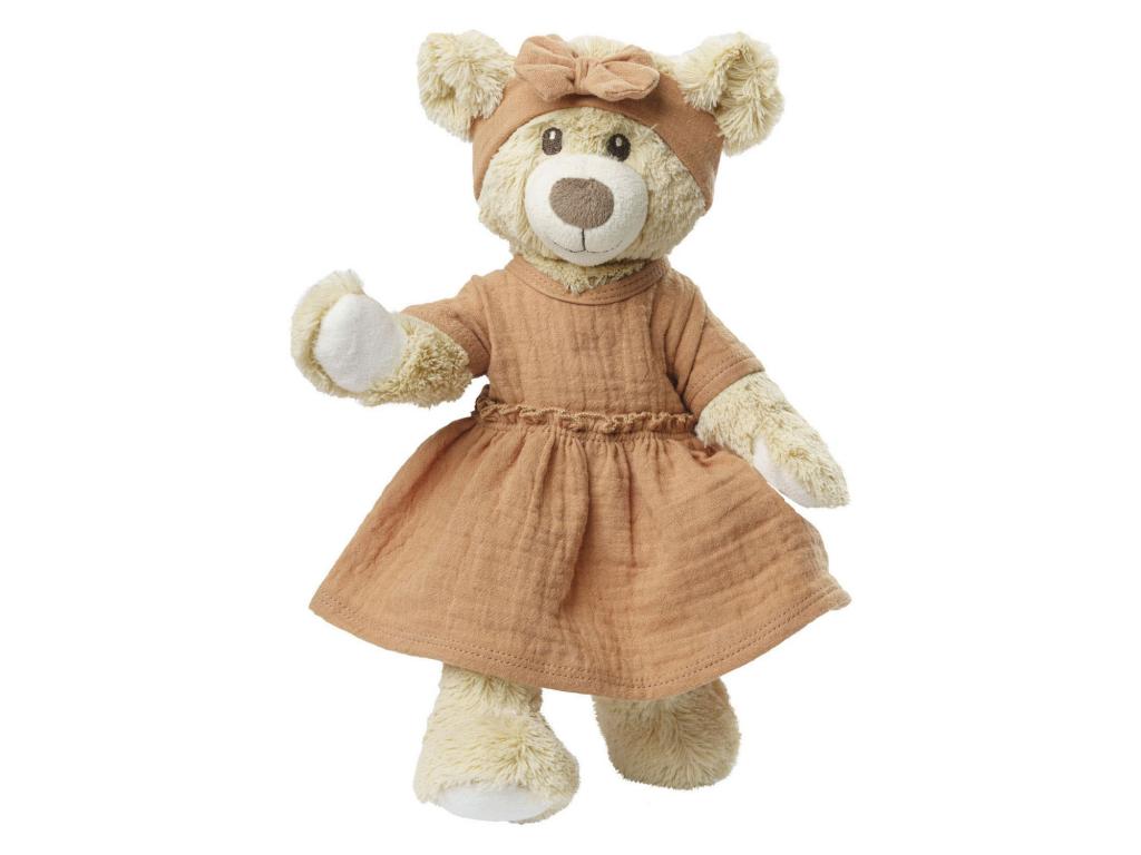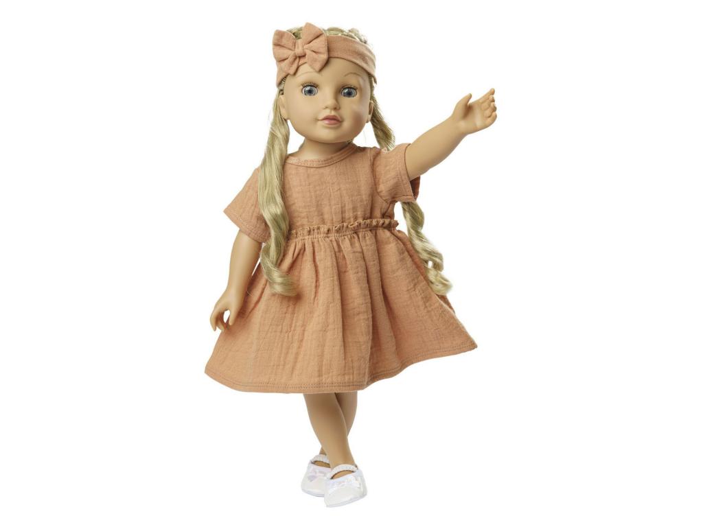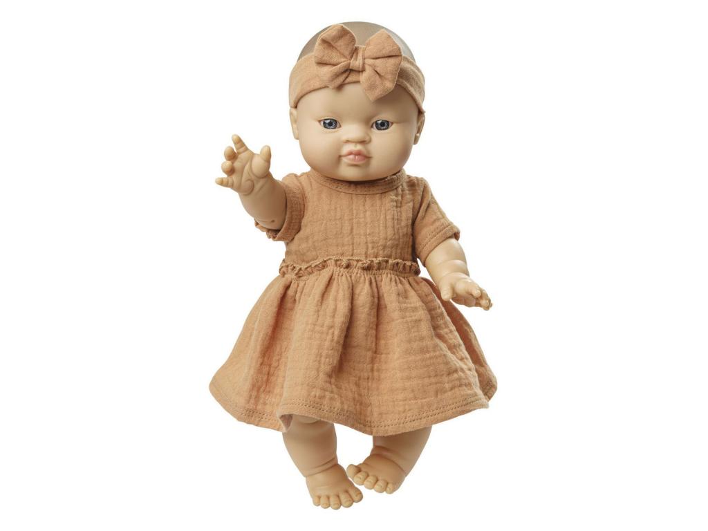 Ez az aranyos, 100% organikus pamutból készült Heless babaruha biztonságos és korlátlan szórakozást nyújt a babáddal. A fodros ruha és a hozzá illő hajpánt divatos, puha barna színben nemcsak imádnivalóan néz ki, hanem minden szempontból jó érzést is nyújt. A tanúsított ökológiai gazdálkodásból származó puha muszlinszövet a deréknál enyhe fodorral gyönyörű sziluettet teremt babádnak. A hozzá illő hajpánt masnival rugalmas, így tökéletesen illeszkedik minden baba fejére. Egy bájos kialakítású babaruha, amely lágy színével, kiváló minőségével és egyszerű eleganciájával nyűgöz le. A hátul található tépőzáras rögzítésnek köszönhetően a babaruha nagyon könnyen felvehető és levehető. A ruha a legtöbb, 28-35 cm hosszúságú babára illik a piacon. Más változatban is kapható 35-45 cm-es babák számára (cikkszám: 2424). A ruhadarabot fából készült fogason szállítjuk. Tulajdonságok - gyönyörű ruha fodrokkal - 100% organikus pamutból készült - hozzáillő fejpánttal - a tépőzárnak köszönhetően könnyen fel- és levehető - fából készült fogason - 28-35 cm-es babákhoz alkalmas Alkalmas 3 éves kortól.