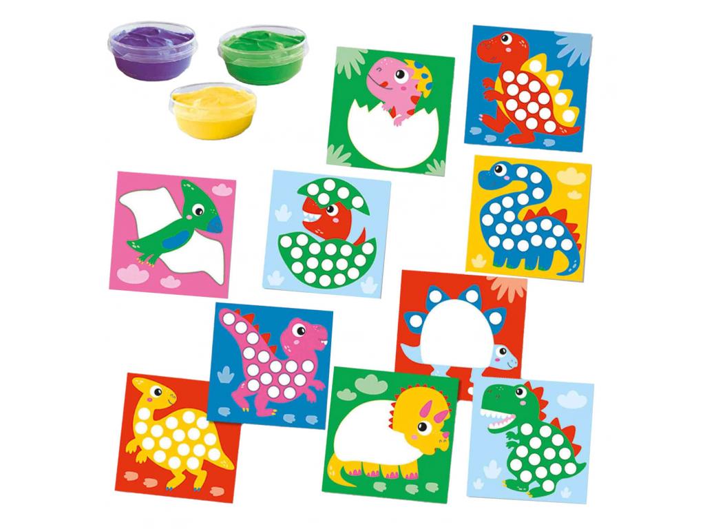 Ez a 10 vidám dinoszauruszos kártya már a legkisebbek számára is szórakoztató kézműves élményt nyújt. A készlet 10 dinoszaurusz kártyát és 3 színű ujjfestéket tartalmaz. A gyerekek tetszésük szerint díszíthetik a különböző dinoszauruszokat, az ujjaikkal pecsételve vagy kenegetve őket. Szórakoztató tevékenység a kisgyermekes szülőknek, és mindig van olyan házi készítésű eredmény, amelyre büszkék lehetnek!