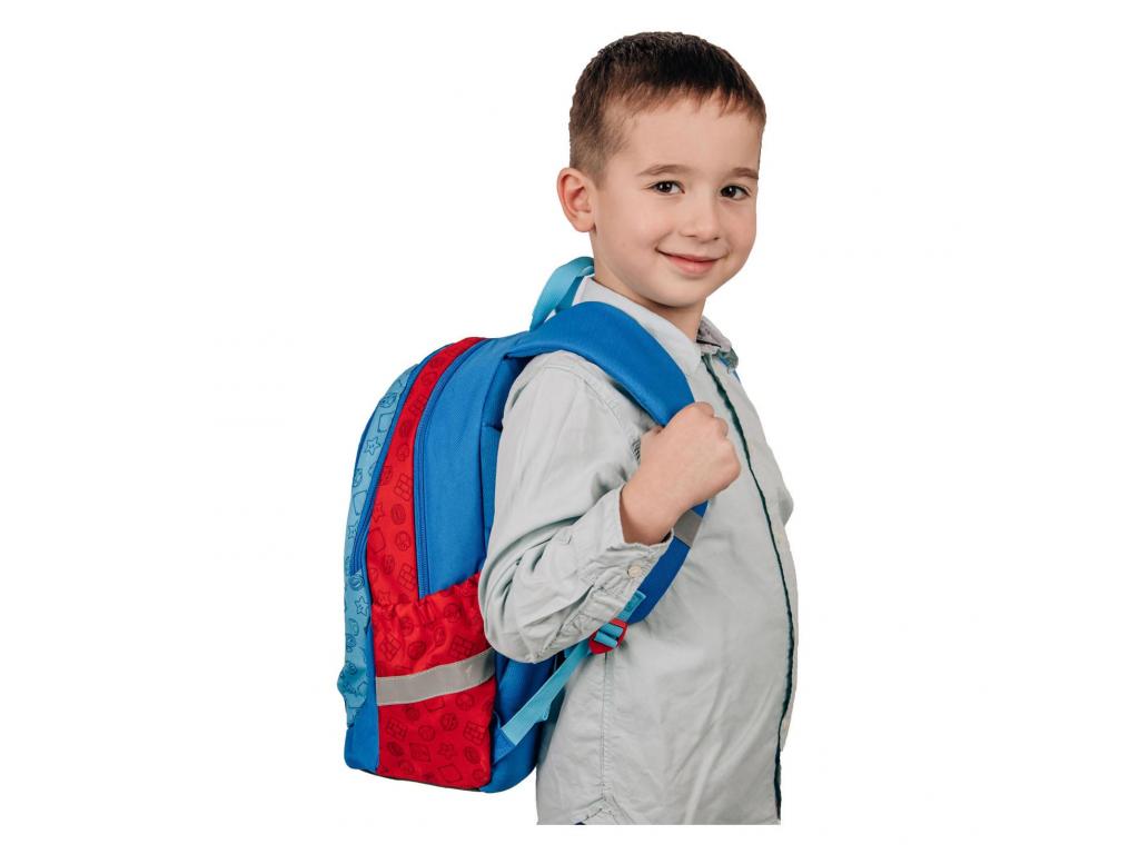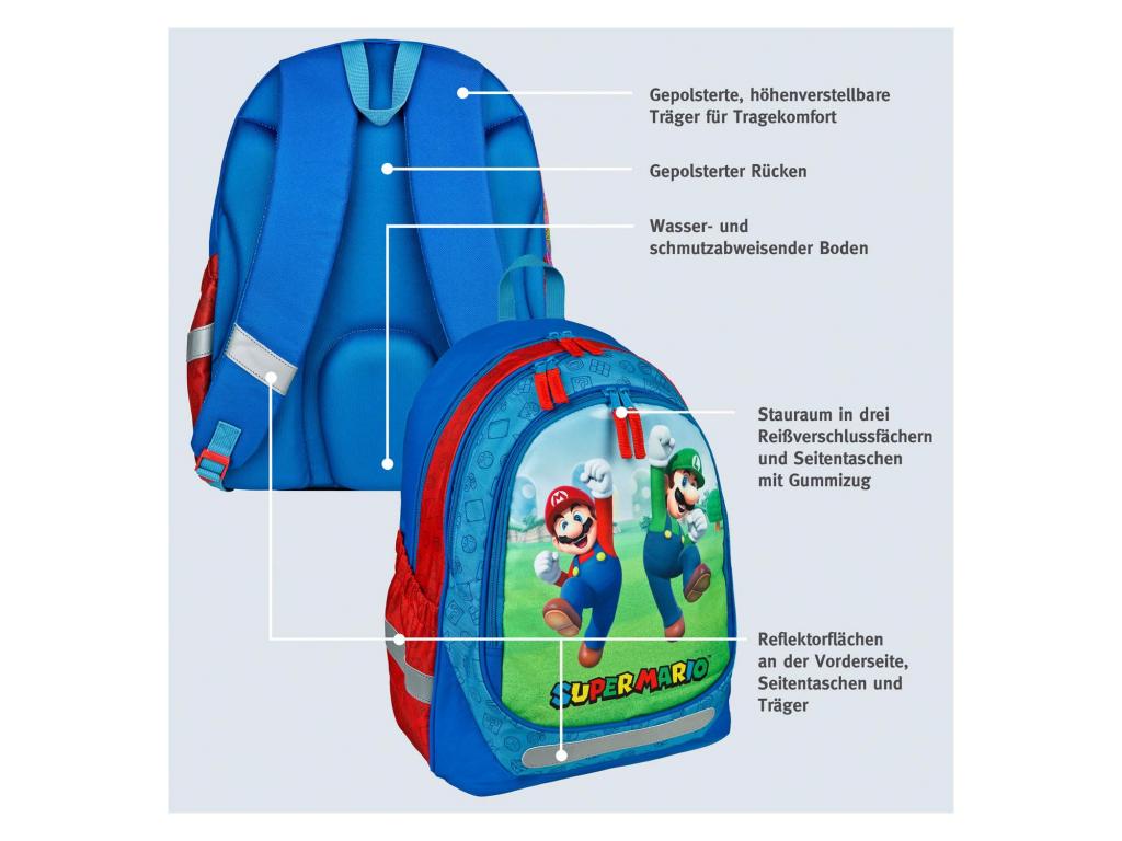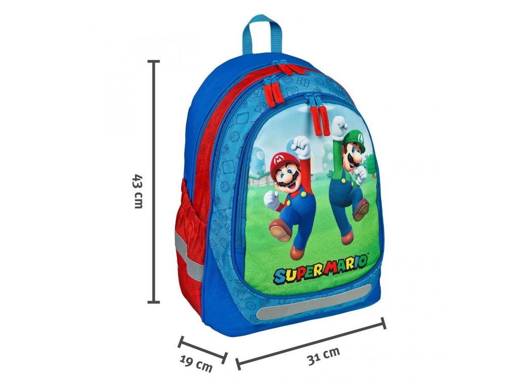 Super Mario hátizsák 3 rekesszel, állítható vállpántokkal, fényvisszaverő csíkokkal és vízlepergető alappal. A táska mérete 31 x 43 centiméter, és kb. 17 literes űrtartalommal rendelkezik.