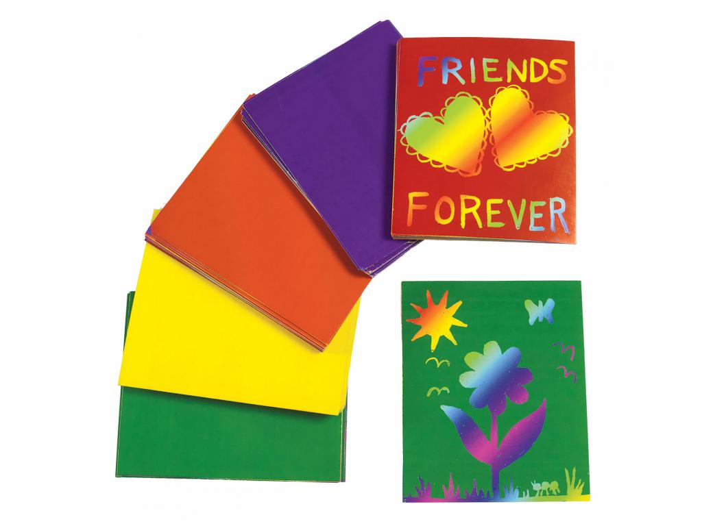 A színek dupla szivárványa! Ez a strapabíró karton átlátszó színű bevonattal rendelkezik, amely lekaparva többszínű mintát mutat az alján. Minden egyes műalkotás egyedi megjelenésű. Színenként 20 darab 5 élénk színben: Zöld, narancssárga, lila, piros és sárga színben. Minden egyes tábla mérete 15,2 x 12,7 cm. Tartalom: 100 darab. Alkalmas 3 éves kortól.