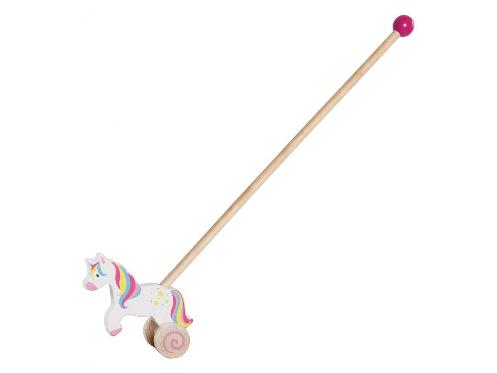 A járástanulás kétszer olyan szórakoztató egy fából készült, tologatható figurával. A fehér, színes sörényű egyszarvú elkíséri gyermekét a világ felfedezésében, és mozgásra ösztönzi. Méretek: 16,5 cm. Anyag: fa. 18 hónapos kortól alkalmas.