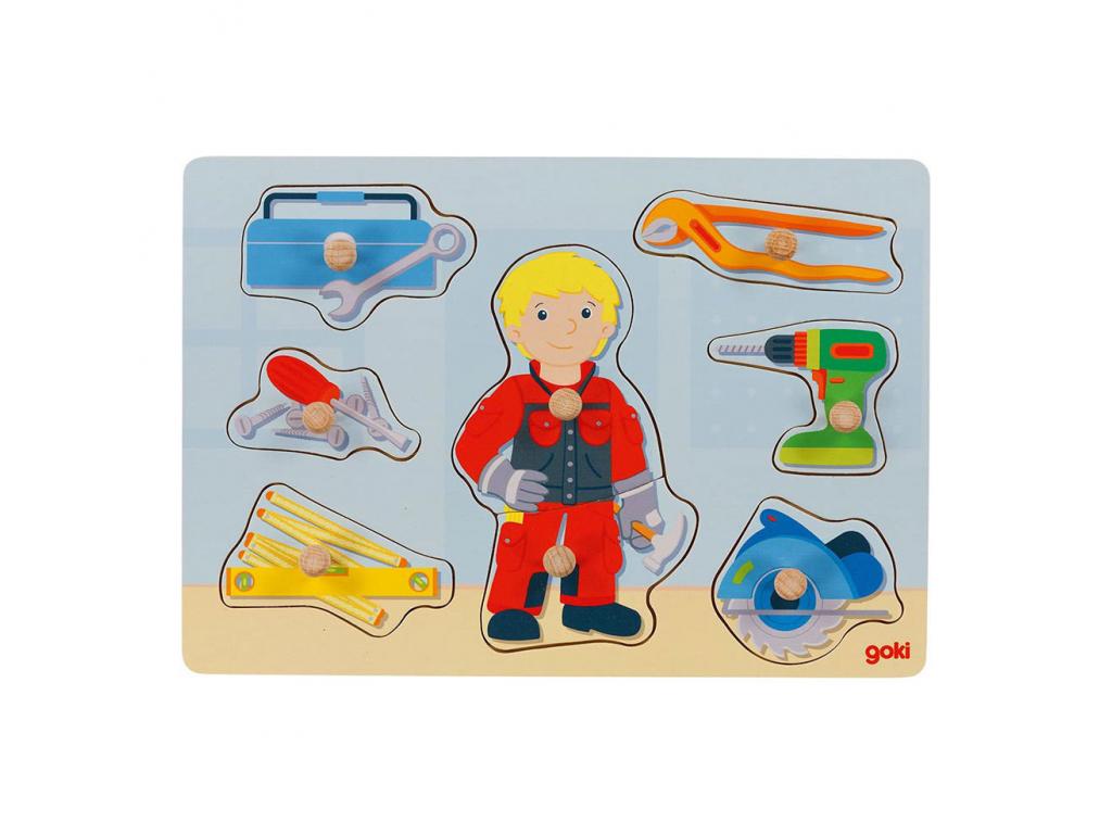 Az extra nagy gombok és a gyermekbarát képek miatt ez a kirakó ideális első kirakójátéknak. 7 darabból áll, különböző szerszámokkal és egy ezermesterrel. Méretek: 30 x 21 x 2,4 cm. Anyaga: fa. Alkalmas 1 éves kortól kezdődően.