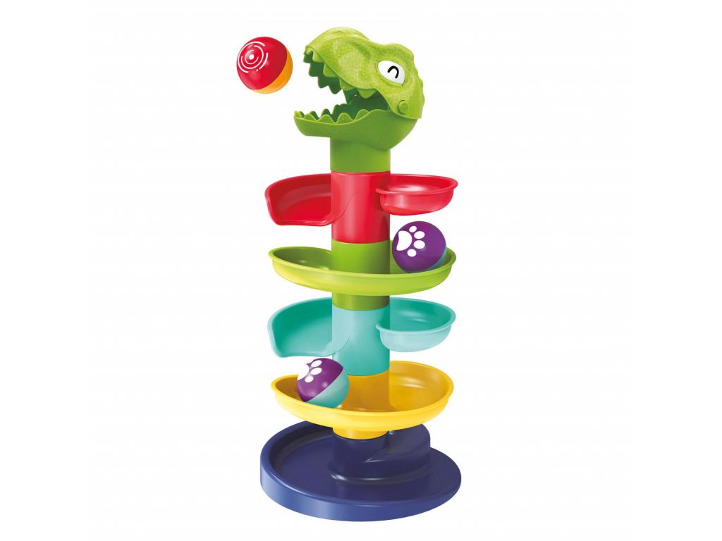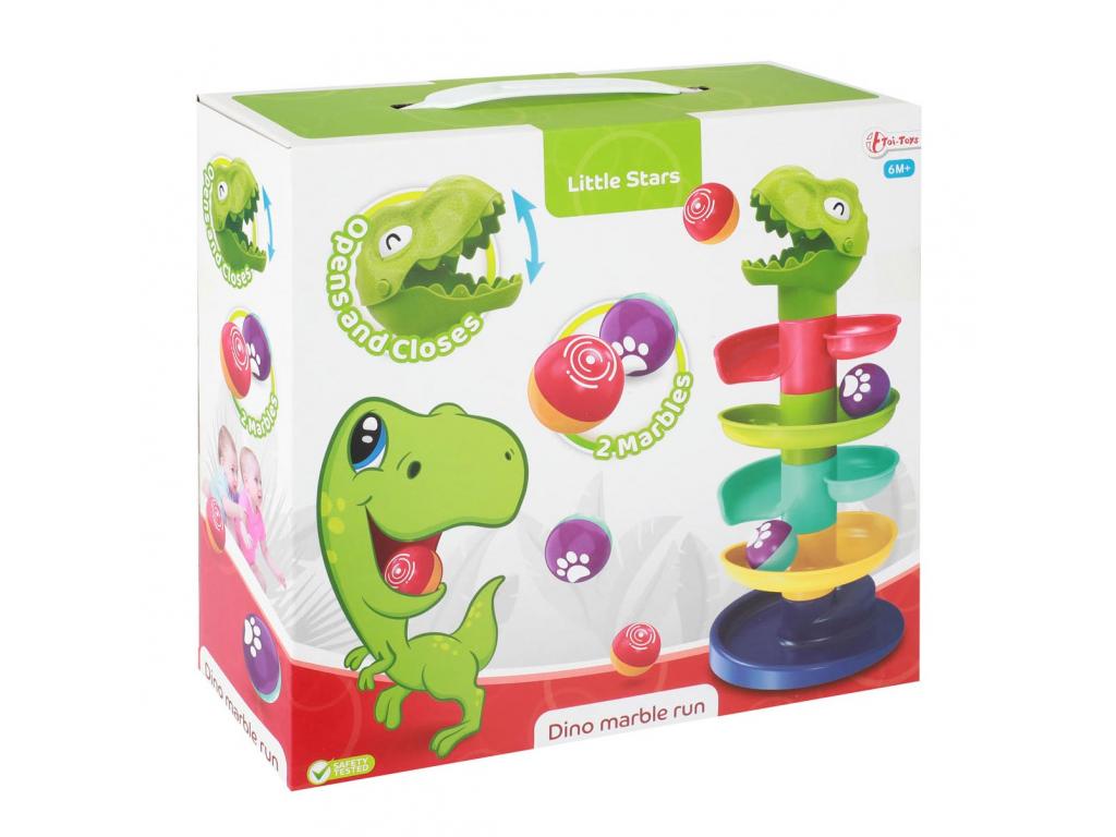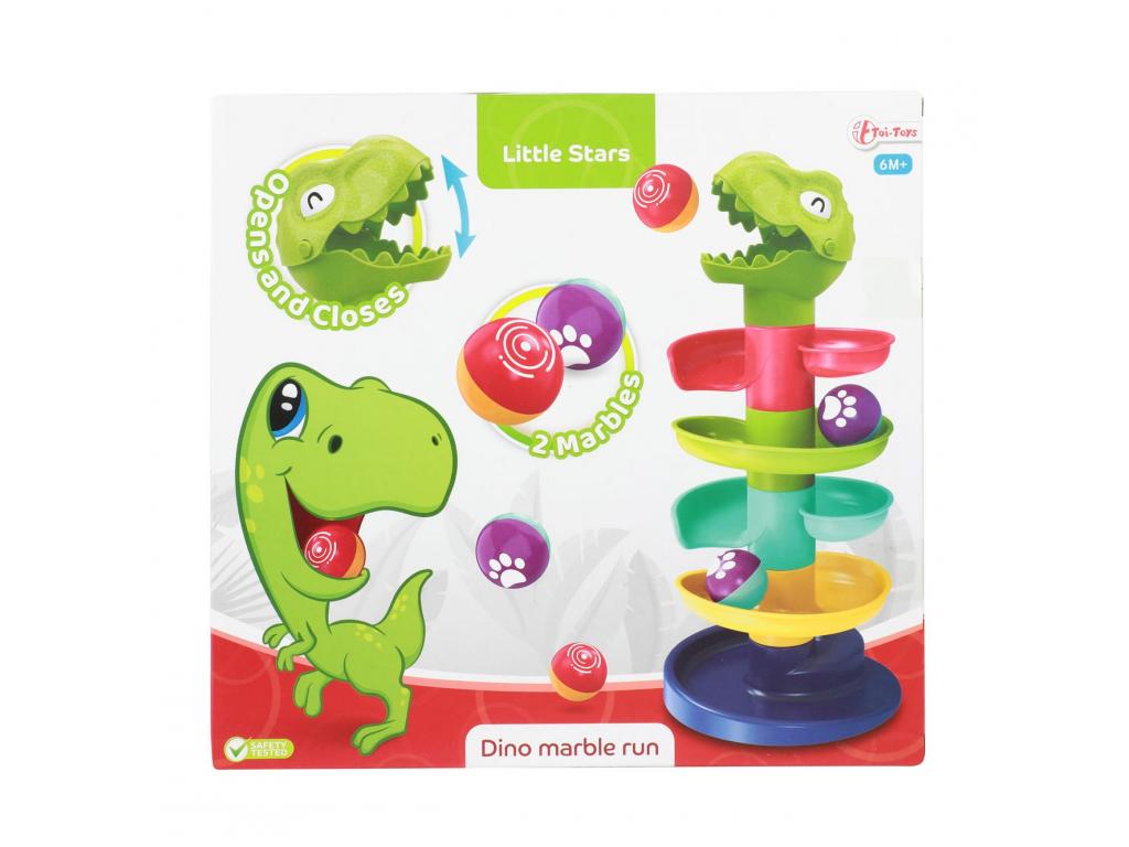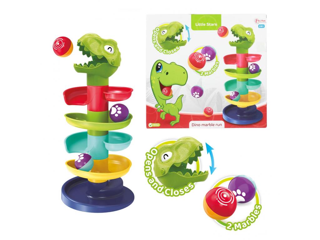 Szórakoztasd meg a kicsiket ezzel a szuper aranyos dinoszaurusz golyófutó toronnyal a Little Stars termékcsaládból. Kattintsd a 4 pályadarabot az alapra, és helyezd rá a dinoszaurusz fejet. Helyezd a golyókat egyenként a legmagasabb pontra, és nézd, ahogy együtt gurulnak lefelé. Fogadjunk, hogy a baba újra és újra látni akarja majd ezt! A színes, nyomtatott golyók két különböző felükkel rendelkeznek, ami különösen vonzó hatást kelt. Vagy rejts egy labdát a dinoszaurusz szájába. Vajon gyermeke tudja, hol van a labda, vagy ki meri venni? Rengeteg játék és felfedezés, miközben a kisgyermeked egyúttal a szem- és kézkoordinációját is edzi.
