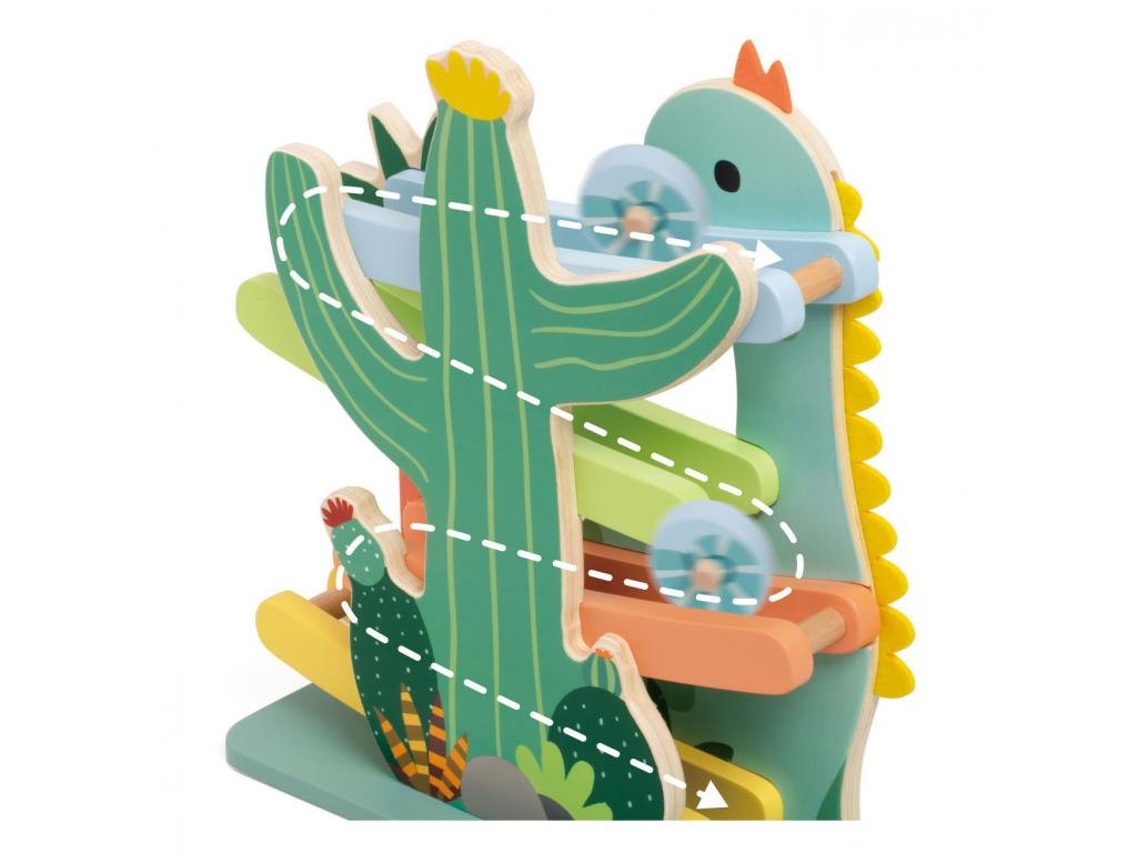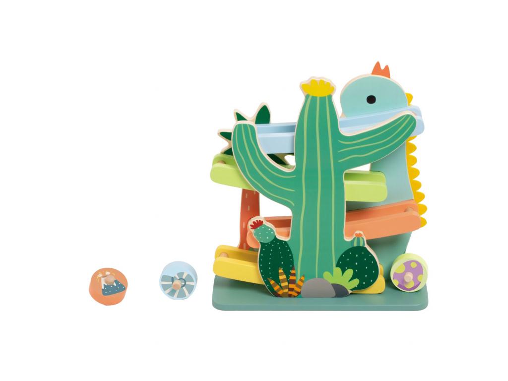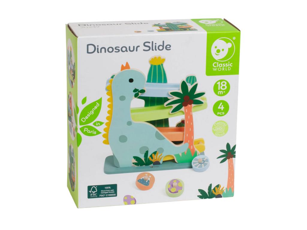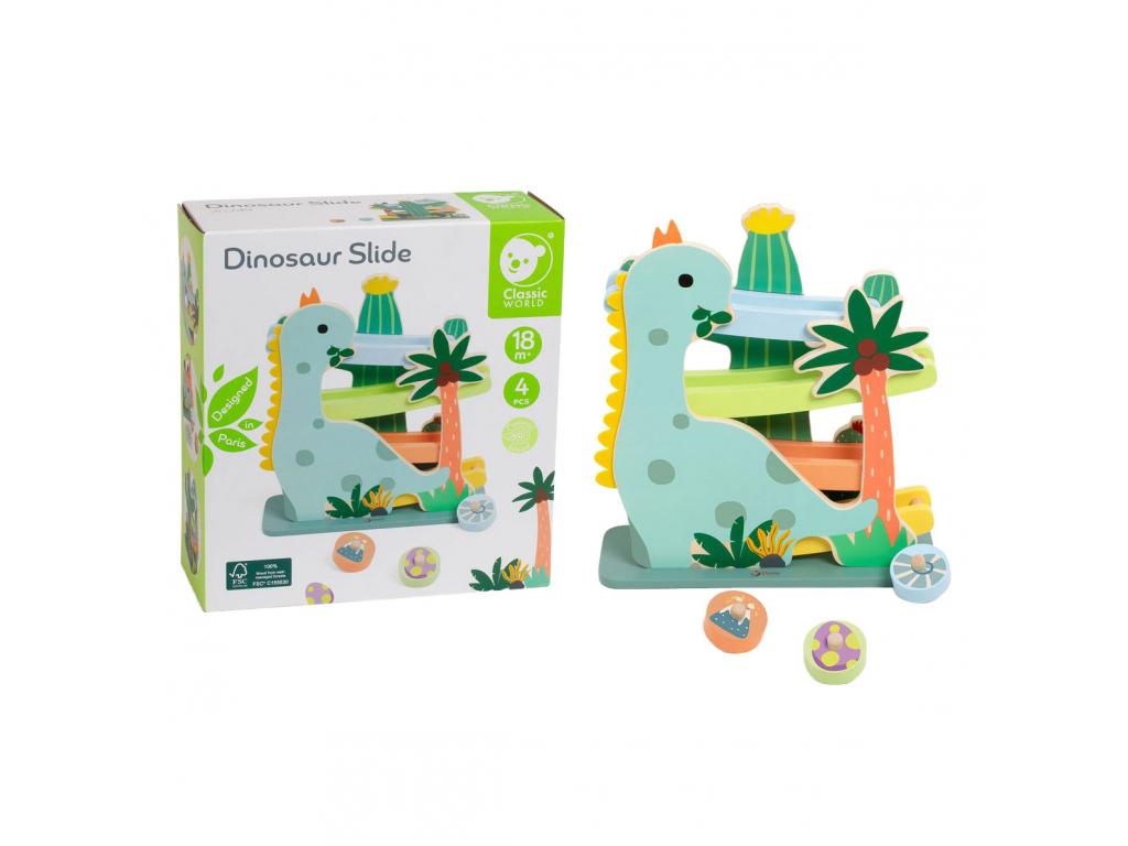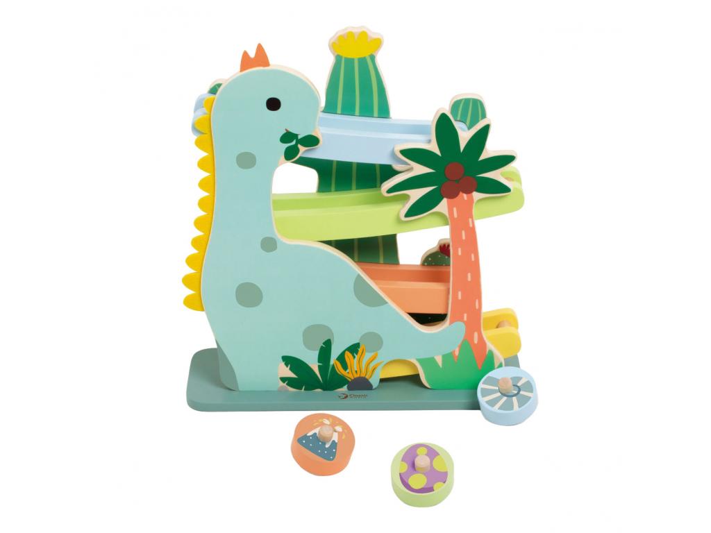 Fa csúszda dinoszaurusz motívummal. A készlet tartalmaz egy fa csúszdát és 4 fakorongot, amelyek legurulnak a csúszdán. Legalább 18 hónapos korú gyermekek számára alkalmas.
