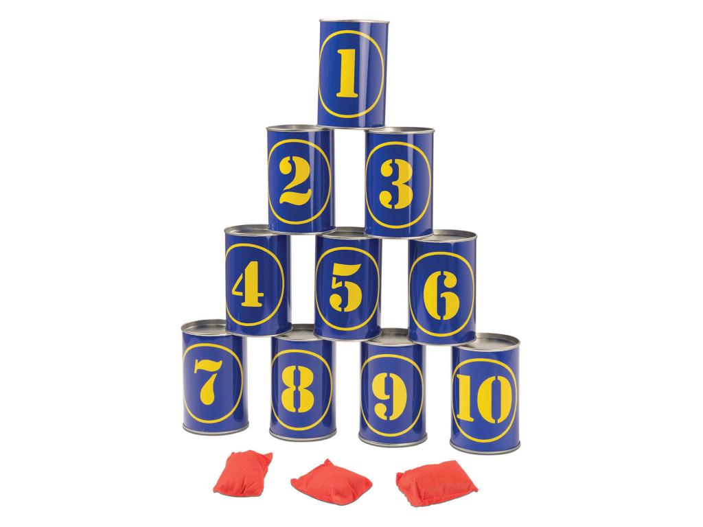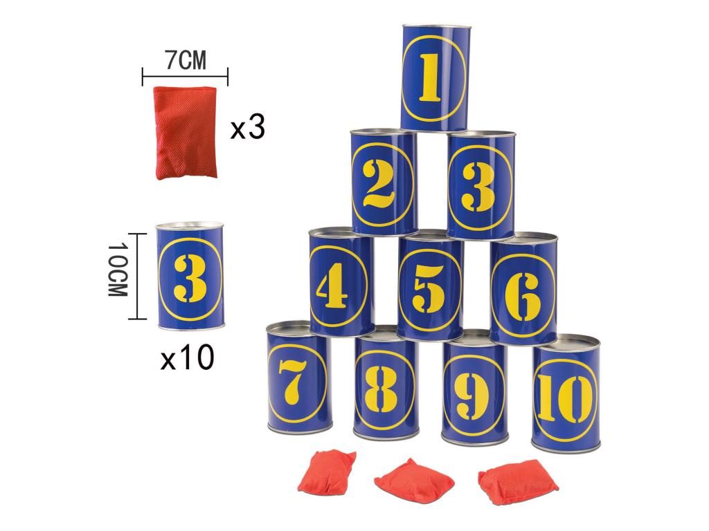 Bádogdobálós játék 2 játékosnak. Tartalom: 10 konzervdoboz és 2 babzsák a dobáshoz. Alkalmas 5 éves kortól.