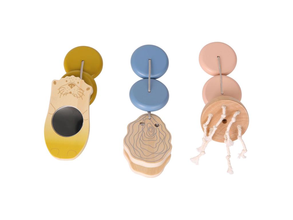 Ez a modern bébi tornaterem fából készült, és mindenféle szórakoztató ingereket kínál: egy tengeri vidra tükörrel, amelyben a gyermek láthatja magát, egy medúza zsinórcsápokkal, amelyeket megérinthet és tapinthat, valamint egy őrült osztriga, amely úgy szól, mint egy csörgő kasztanyett, és akusztikus ingereket kelt. A diszkrét kialakítás, valamint a természetes anyagok, a puha formák és a finom, de divatos színek - füstöskék, mustársárga és szürkés rózsaszín - az életkornak megfelelő szórakozást biztosítanak, érzékszervi túlterhelés nélkül. A tartozékok a rögzítőkorongok behelyezésével könnyen cserélhetők. A látható fa anyag nagy arányának köszönhetően abszolút szemet gyönyörködtető, és hasznos első játék a fekvő babák szórakoztatására és motorikus készségeinek erősítésére: a tengeri vidra, az osztriga és a medúza szerszám nélkül, áthelyezéssel rögzíthető a három nyíláson. És ezt jó tudni: A háromdimenziós játékelemek könnyen felismerhetők, különösen a fekvő babák számára! Az egymásba illeszkedő oldalsó részeknek és a két csavarnak köszönhetően a játékív könnyen összeszerelhető. Tulajdonságok - Nagyméretű, stabil fából készült játékív a fekvő babák szórakoztatására és motorikus képességeinek edzésére - Különösen stabil, egymásba illeszthető szerkezet - Három különböző 3D-s játékelemmel - Méretek: 56 x 60 x 52 centiméter. - Alkalmas 0 hónapos kortól
