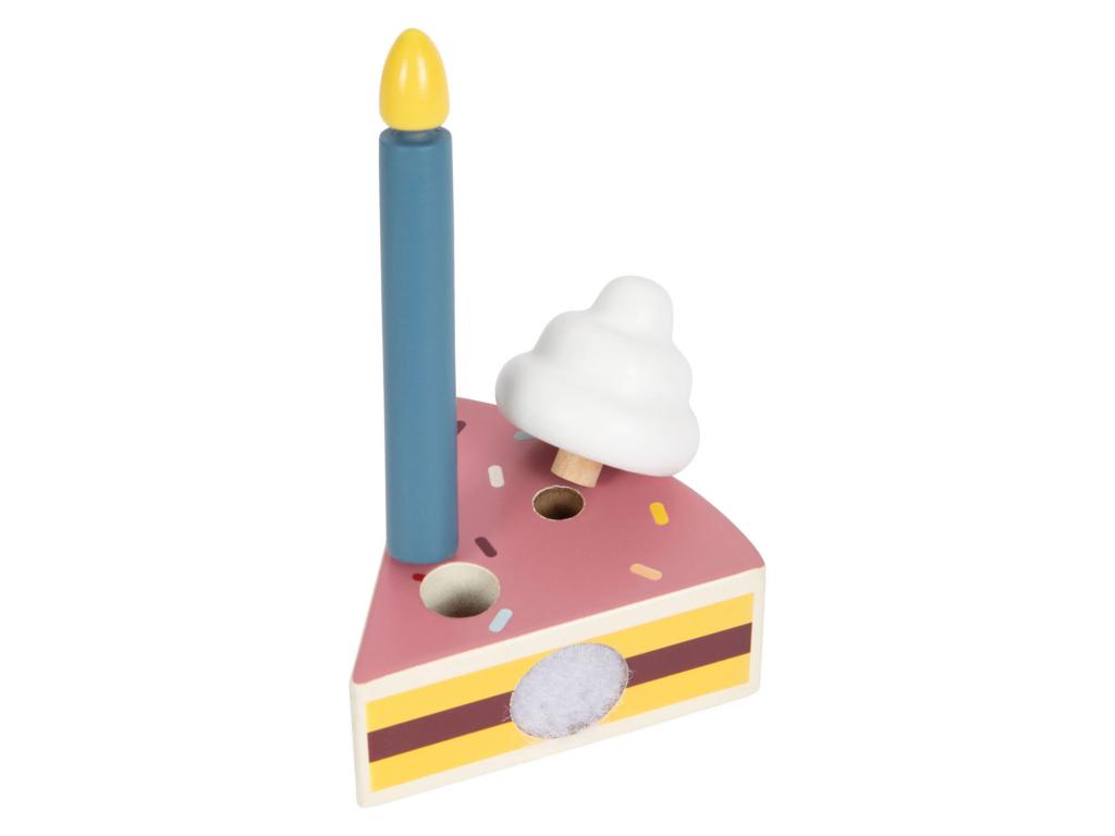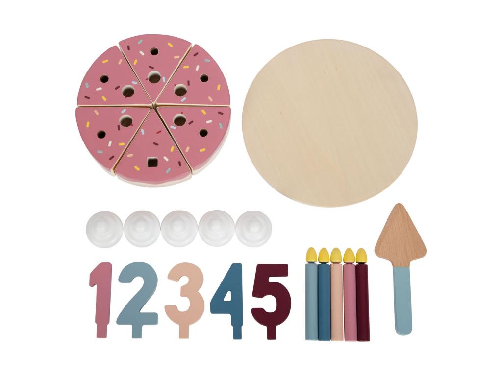 A születésnapi torta elengedhetetlen! Akár a születésnapi asztal díszeként, akár a gyerekszoba szerepjátékához - ez az FSCŽ 100%-ban tanúsított fából készült, krémes és színes szórással ellátott születésnapi torta minden dohányzóasztalon szemet gyönyörködtető! Ez a játékkészlet 6 darab tortából, egy kivehető tejszínhabos pacalból, gyertyákból és az 1-5 számokból áll, és rengeteg lehetőséget kínál a játékra és a díszítésre. Tépőzáras rögzítők tartják össze a feltétet és az egyes tortadarabokat, amelyek a tortaemelő segítségével könnyen szétválaszthatók és eltávolíthatók a tortaformából. Ez egy szórakoztató módja a motoros készségek és a szem-kéz koordináció edzésének. A szerepjáték során a gyerekek szabadjára engedhetik a fantáziájukat, és igazi születésnapi partit rendezhetnek babáiknak vagy plüssállataiknak. A torta díszítése a rugalmas dekorációkkal szintén edzi a finommotoros készségeket. Tulajdonságok - Születésnapi torta játékkészlet tortaállvánnyal és tortaemelővel, FSCŽ 100%-os minősítésű fából - Öt gyertyával, tejszínhabbal és számokkal díszítésként - A számok 1-5-ig cserélhetők - A tortadarabok tépőzárral kapcsolódnak egymáshoz, és a tortaemelővel elválaszthatók egymástól, illetve egyenként kivehetők a tortaformából - Méretek: Magasság kb. 30cm x 11cm, O kb. 18 cm - 3 éves kortól alkalmas.